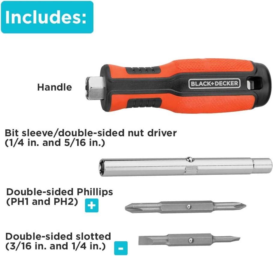 The beyond by BLACK+DECKER 6-in-1 Multibit Screwdriver is the perfect addition to any DIYer’s tool bag or “junk” drawer. With two double-sided bits that fit conveniently in the handle and the bit sleeve that doubles as a two-sided nut driver, this space-saving screwdriver serves as six tools in one allowing you to tackle a variety of tasks around the house. Bits included: (2) Phillips: PH1 and PH2, (2) Slotted: 3/16 in. and 1/4 in. and (2) Nut Drivers: 1/4 in. and 5/16 in.