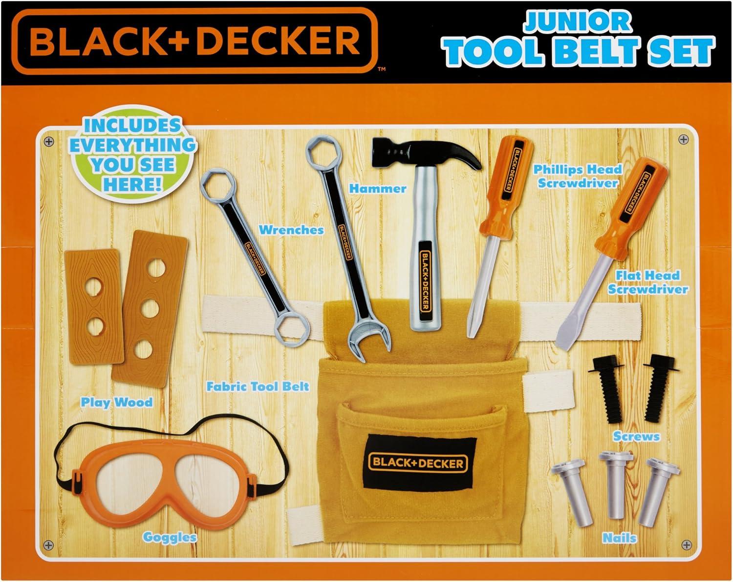 Make sure your little helper is ready for any job with the Black and Decker Junior Tool Belt Set. This 14-piece set comes with realistic-looking kids' tools, including a hammer, screwdriver, wrench, nails and other accessories round out the set. Tuck it all away in the included kids' tool belt, complete with the Black and Decker logo. For ages 3 and up.