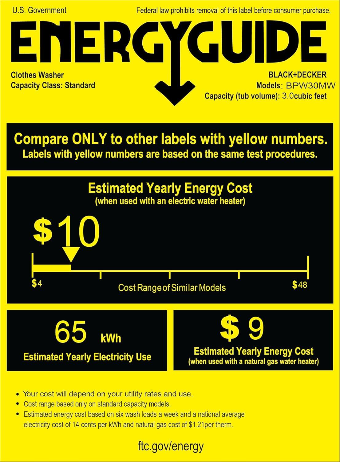 When it comes to washing machines, this outstanding BLACK+DECKER portable washer (17.3” x 17.7” x 31.1”) is your ultimate solution to immaculately clean clothing for household use. There are 5 cycles to choose from with this fantastic 0.9 cu. ft. washer, which include Heavy, Gentle, Normal, Rapid, and Soak. Cold water temperature settings available with three water level choices for small, medium, and large loads. Inside this small washer (48.4 lbs.), you’ll find an incredible stainless steel tub that’s rust and corrosion-resistant with a quiet close top loading transparent lid. Because this unit is an impeller washer, it’s perfect for lingerie and delicates as it doesn’t have an agitator to cause entanglement problems. Also, you can use for soiled baby clothing and diapers, but must run them separately from other loads. You can also easily wash baby clothing and diapers, as well as lingerie without entanglement problems common with agitator washers. Place anywhere in your home or area with 2 rollers, 2 side handles, and 1 adjustable front leveling leg. This unit comes with a drain hose and quick connect sink adaptor. Also included are auto shutoff safety features and Child Lock protection. Get the high quality washing you deserve to live out your day with our amazing BLACK+DECKER portable washing machine. Reinforced packaging is included for total customer satisfaction.