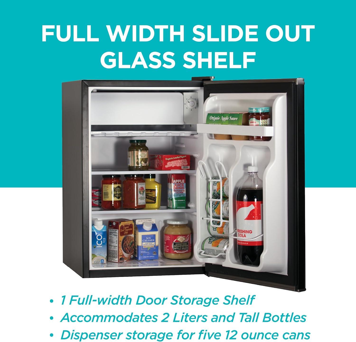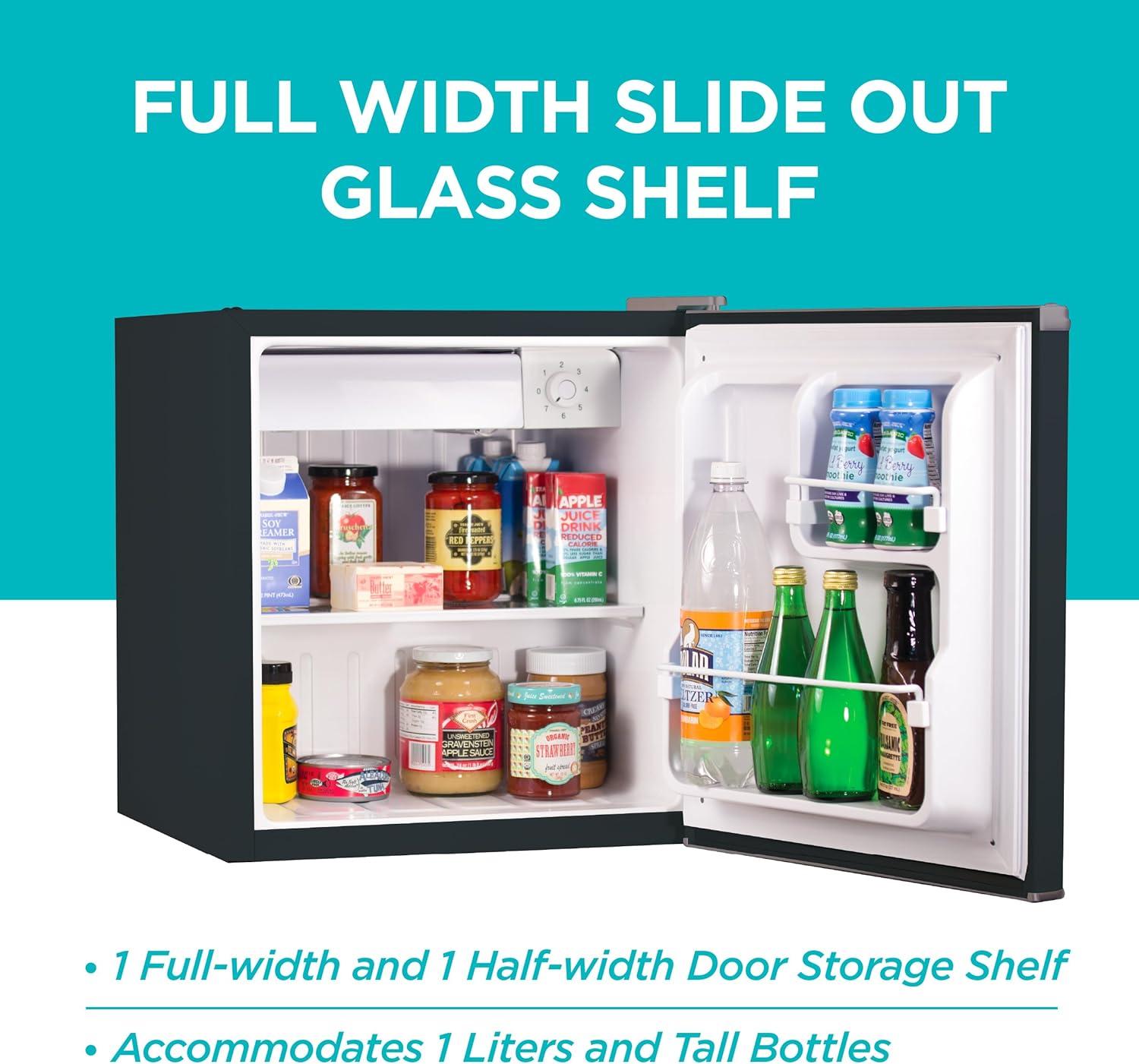 Spacious Capacity: A removable glass refrigerator shelf helps expand storage space while a full and half-width door storage bin accommodates cans and small containers or 1-liter or taller bottles