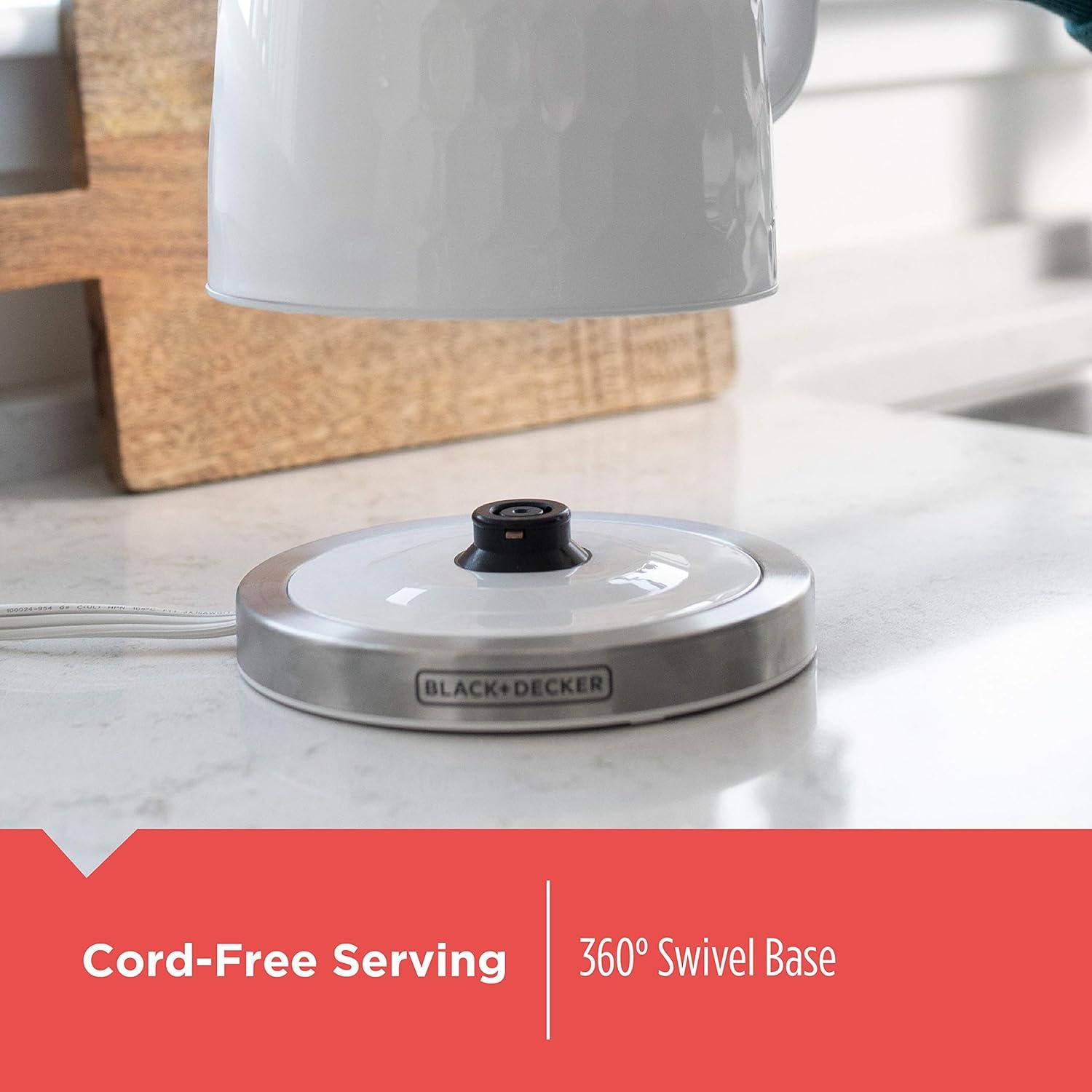 Premium design meets top performance. The BLACK+DECKER™ Rapid Boil 1.7L Electric Cordless Kettle is part of the Honeycomb Collection, featuring a premium textured finish and stainless steel accents that will complement your kitchen aesthetic. And it delivers on performance. Rapid Boil Technology boils water more than 2x faster than a stovetop*, delivering you fresh, hot water for tea, hot cocoa, instant meals, oatmeal, French press coffee, and more! Plus, the 360° swivel base allows you to pick up and set down the kettle at any angle for easy, cord-free pouring. Other features include: illuminated water window, rapid boil zone (1-3 cups), boil/dry protection, on/off switch, safety locking lid, cord wrap, removable anti-scale filter, 2-year warranty.*Based on 16 oz. of water boiled on an electric stovetop.