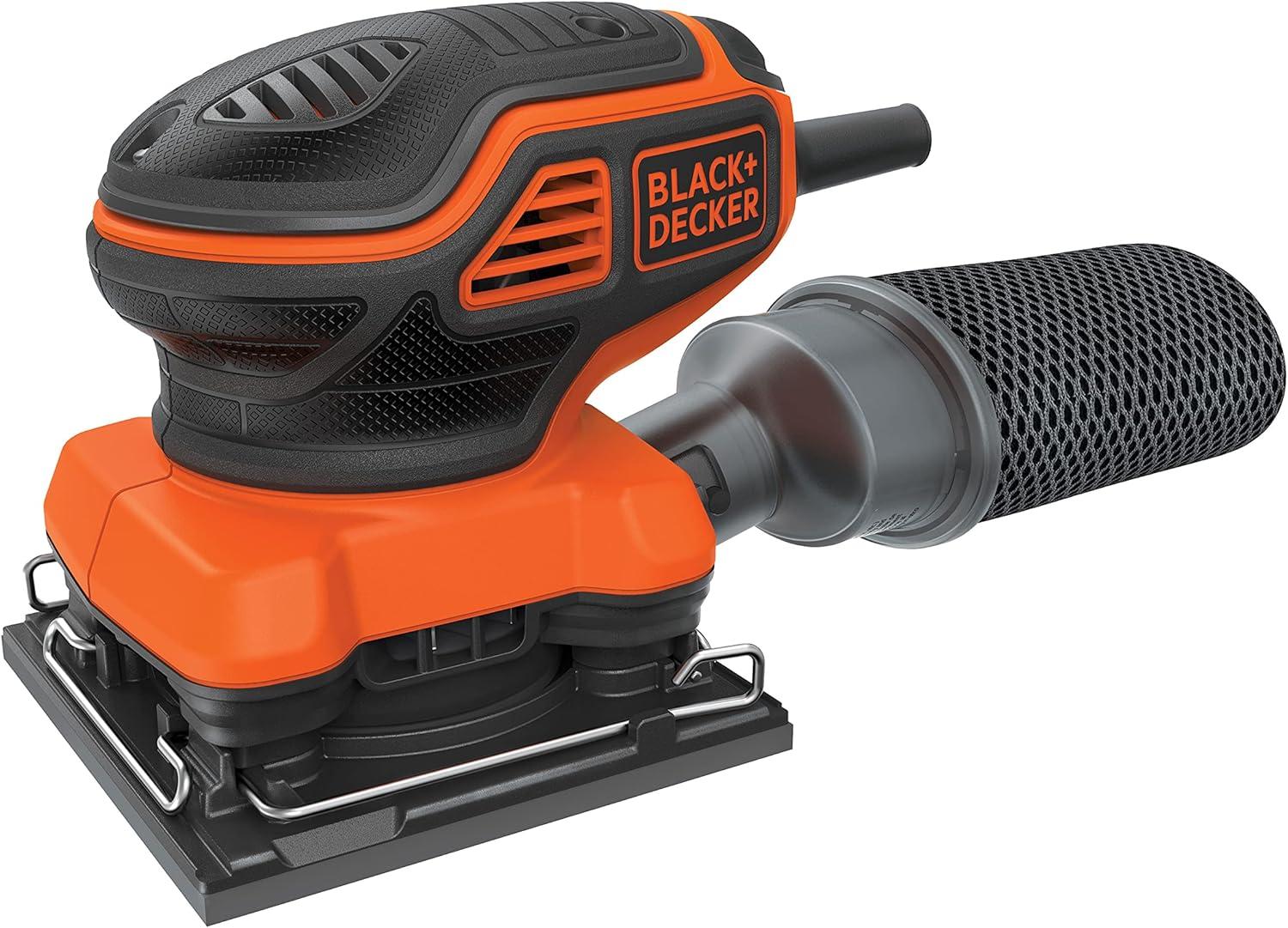 The BLACK+DECKER electric 1/4 sheet orbit sander offers a lot of power for such a compact design. Perfect for surface prep, finish sanding, and detail work on wood, metal, and plastic, this orbital sander is designed with your comfort in mind. The soft-grip paddle switch is located at the top of the sander for natural and convenient on and off. Locking the sander into the on or off position enables easy, one-handed use. This orbit sander also provides access to cramped spaces and sands flush on 3 sides. The 2.0 Amp motor powers 16,000 opm, while the high-performance dust collection bag helps keep the worksurface cleaner. Plus, paper clamps make swapping out the sandpaper really easy. And thanks to its corded design, you'll never run out of power.