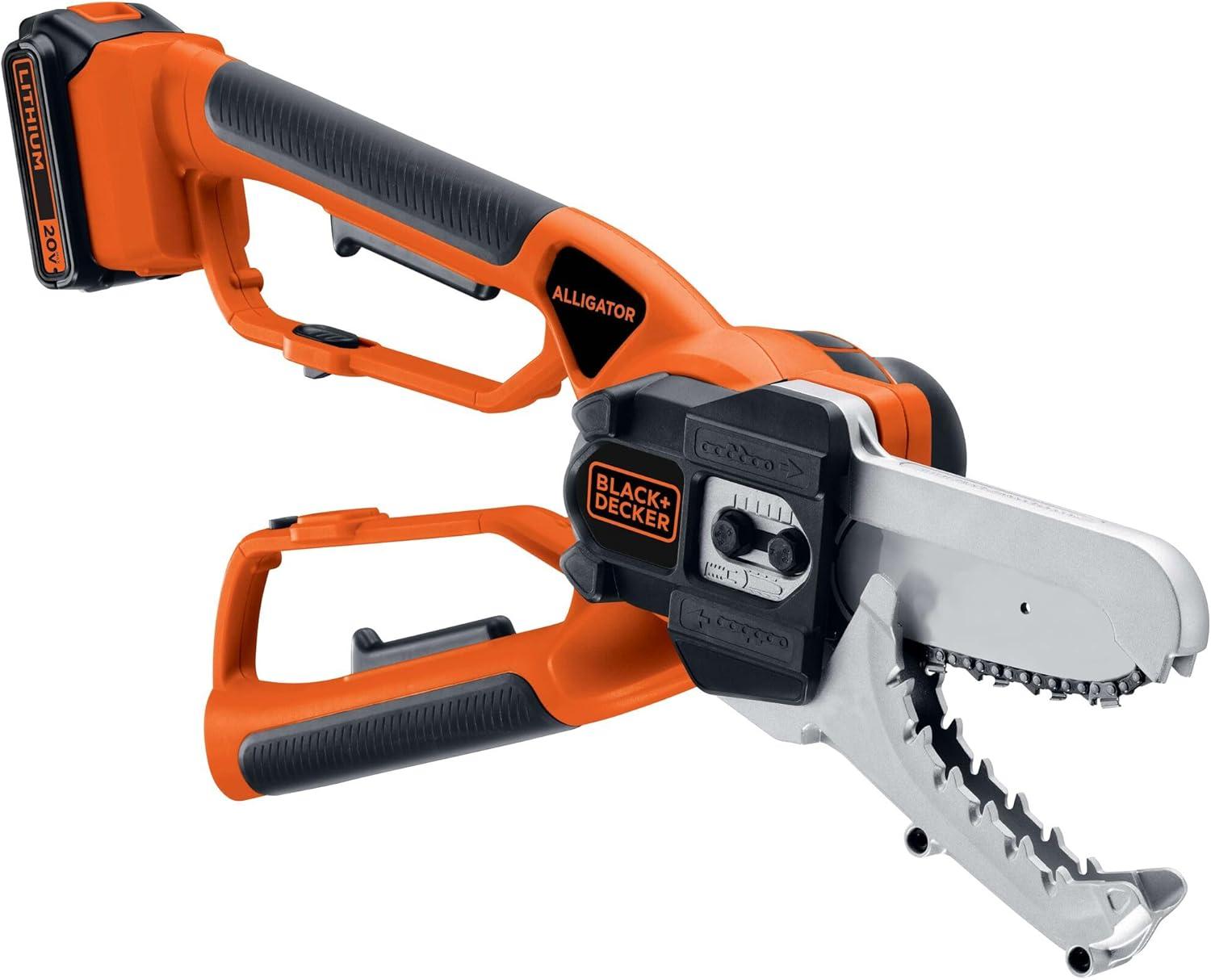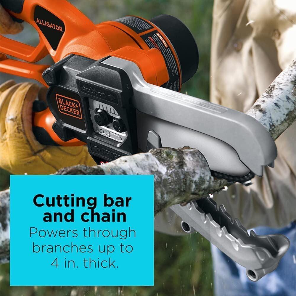 An ideal tool for pruning tree branches up to 4 inches in diameter, cutting branches into manageable pieces, and cutting of fallen branches after storms, the Black & Decker LLP120B cordless alligator lopper provides powerful, fast cutting and its innovative clamping jaws grab and cut in one easy motion. It also includes a heavy duty cutting bar and chain to deliver fast cutting of thick branches and logs.