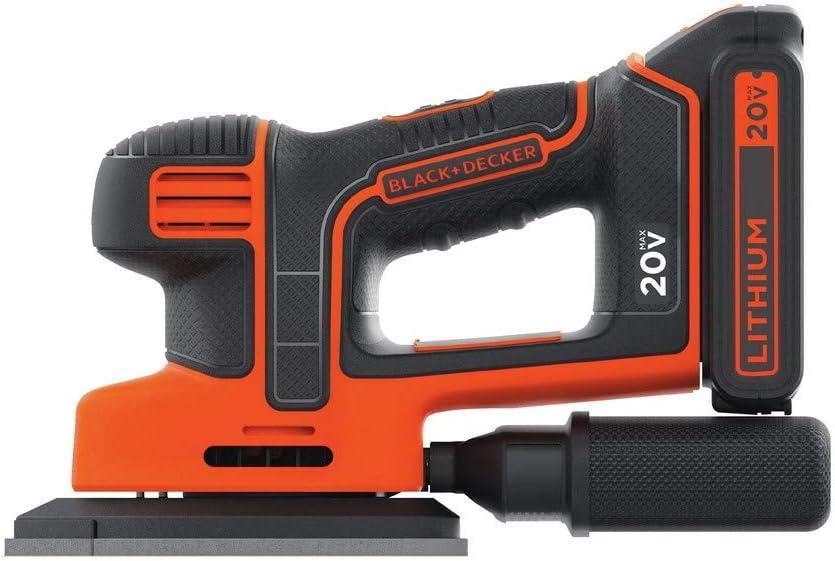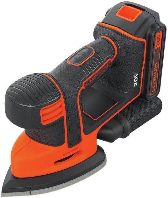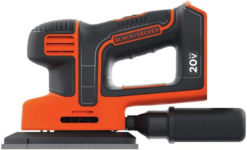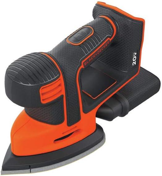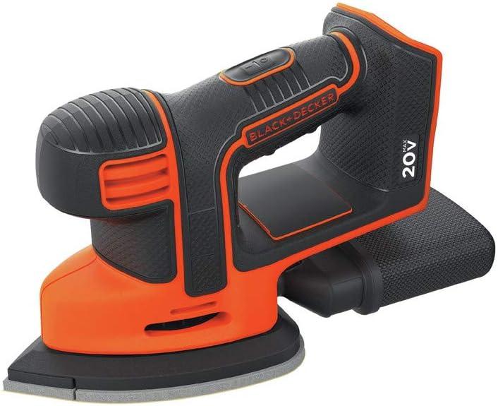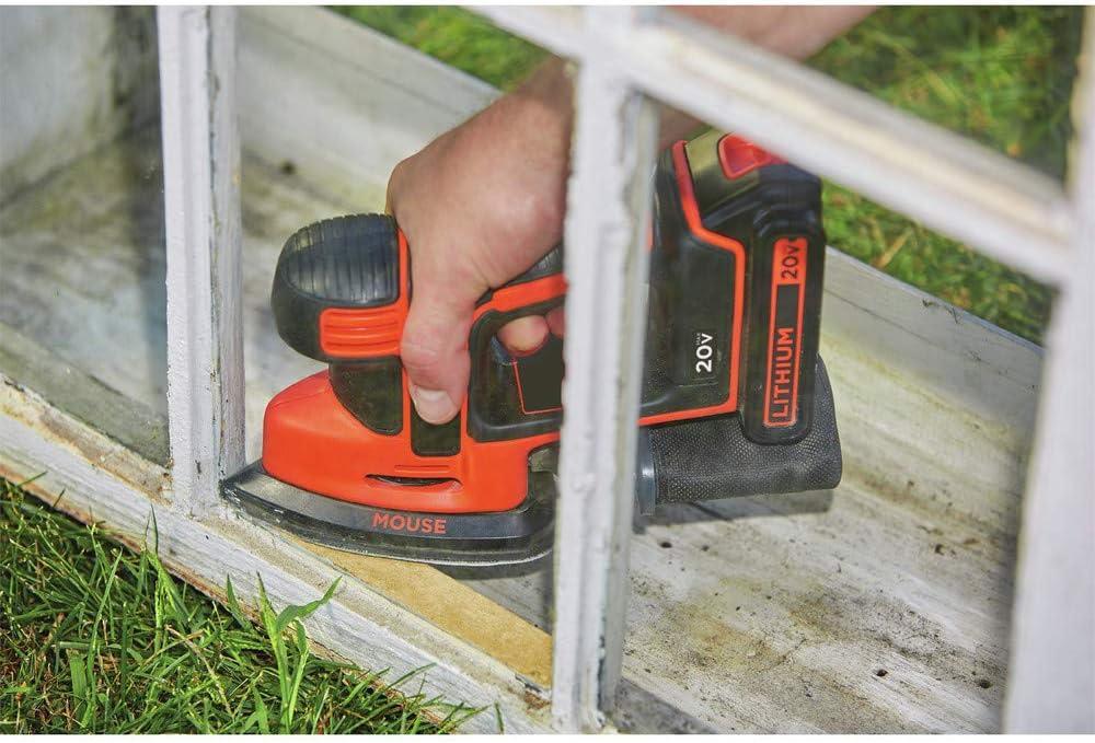 The BLACK+DECKER BDCMS20B 20V cordless Mouse sander, baretool brings cordless convenience to the BLACK+DECKER Mouse® sander lineup. It offers a compact and ergonomic design which helps to provide control and accessibility in tight corners and spaces. The detail finger attachment can be interchanged to help sand hard to reach spaces, with a dust Collection helps to keep the work surface clean. The hook and loop system helps make paper changes easy. Backed by BLACK+DECKER 2 year limited warranty. *This is a baretool item – battery and charger sold separately. Includes: 1) Mouse sander.