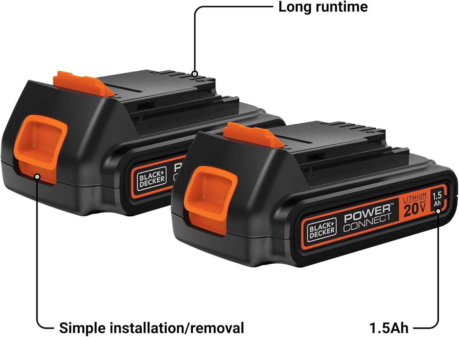 Go cordless with the BLACK+DECKER 20V MAX* POWERCONNECT range of easy-to-use products for in and around the home. The 20V MAX* POWERCONNECT BATTERY platform can be used across BLACK+DECKER 20V MAX* products to power your projects.** Choose from lightweight options of 1.5Ah to 2Ah or opt for 3Ah to 4Ah to get more runtime per charge (2Ah, 3Ah and 4Ah sold separately) Made with high quality lithium-ion cells, POWERCONNECT batteries deliver reliable power. Onboard electronics measure voltage and temperature to protect against overloading and extend the life of the battery. The durable housing helps provide impact protection. Whether the task is for home, garden, DIY, or yard maintenance, the 20V Black and Decker battery easily swaps from tool to tool to take on the task at hand.