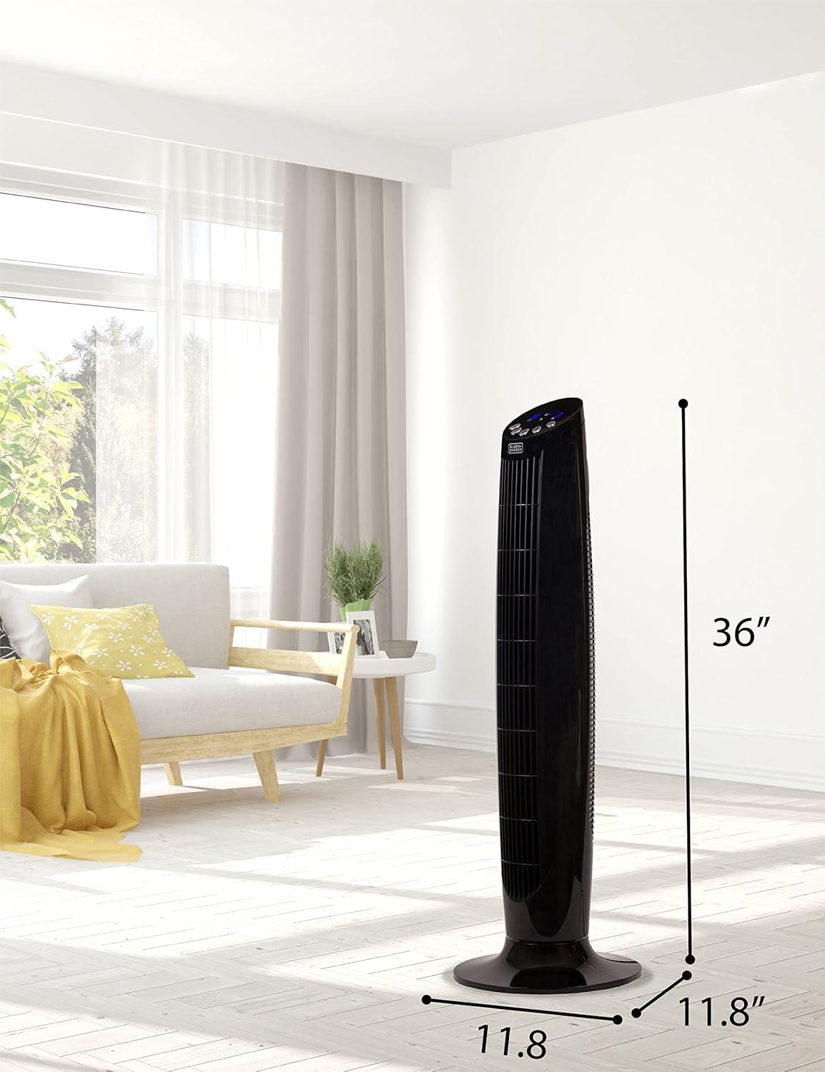 This BLACK+DECKER tower fan is the perfect addition just about anywhere in the house where increased air flow is a necessity. You have three speeds to control just how much air you want to push in a direction or use the oscillation function to expand the scope of the circulation area. With the timer, you don't even need to be around to start and stop your unit. Operating from the controls and digital display unit itself or the “couch potato” remote control, you'll have that much needed relief in seconds. Included Components: Tower Fan, Remote