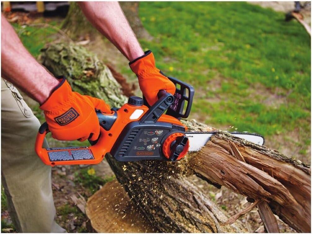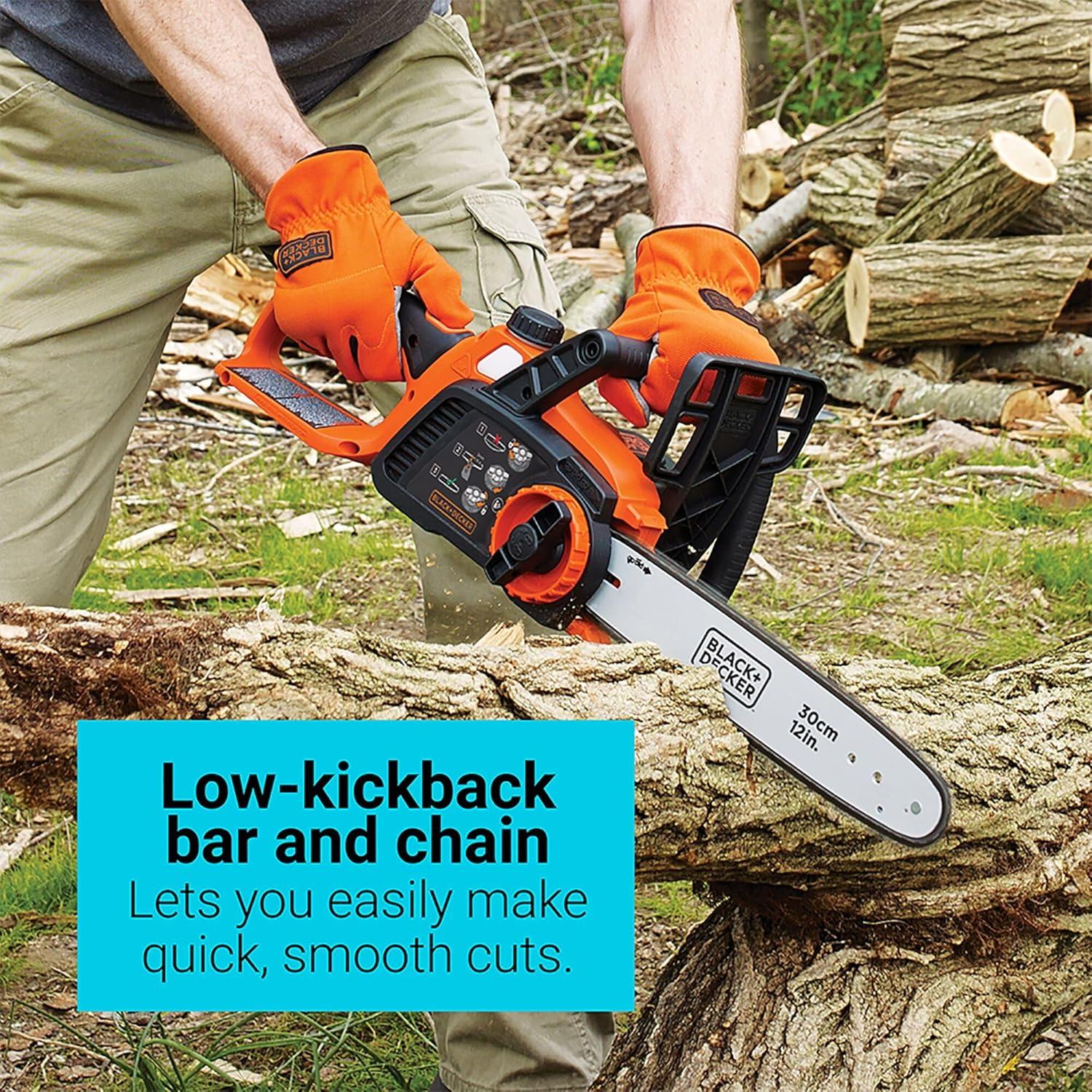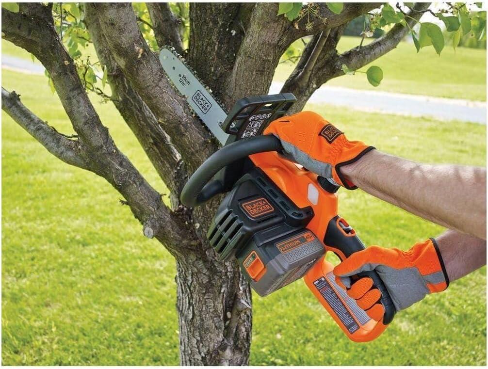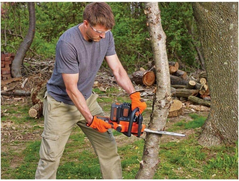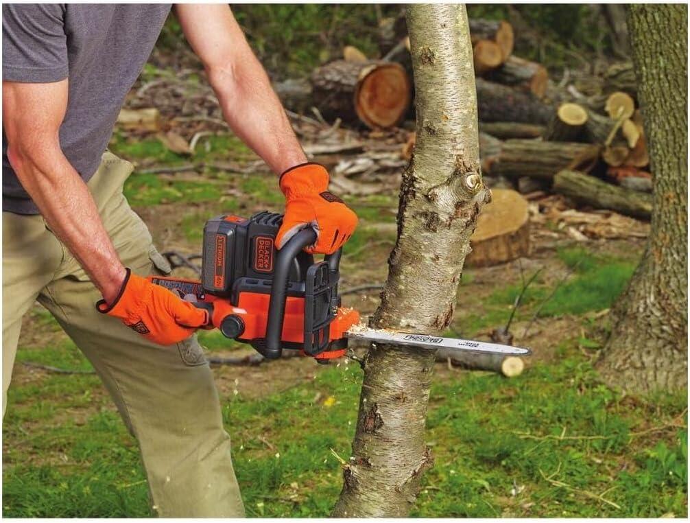 Whether you're tackling routine yard maintenance or a big creative project, you know only the best tools will do. BLACK+DECKER’s 40V MAX* cordless chainsaw offers power and convenience. Don't be fooled by this battery-operated chainsaw’s lightweight maneuverability—on a full charge, it can power through an average of 60 4×4 pine lumber cuts before you’ll need to recharge (battery not included). Thanks to a wraparound grip handle for increased versatility, you’ll even be able to use this chainsaw in angled orientations. A 12 in. OREGON low-kickback bar and chain allow for smooth, fast cuts, while tool-free chain tensioning ensures seamless adjustments. This chainsaw is also equipped with an automatic oiling system, so that lubricating the bar and chain is simple and straightforward. Design elements like a front hand guard and a lock-off button put your safety at the forefront, and when you're not using your chainsaw, the guide bar scabbard protects the blade. *Maximum initial battery voltage (measured without a workload) is 40 volts. Nominal voltage is 36 volts.