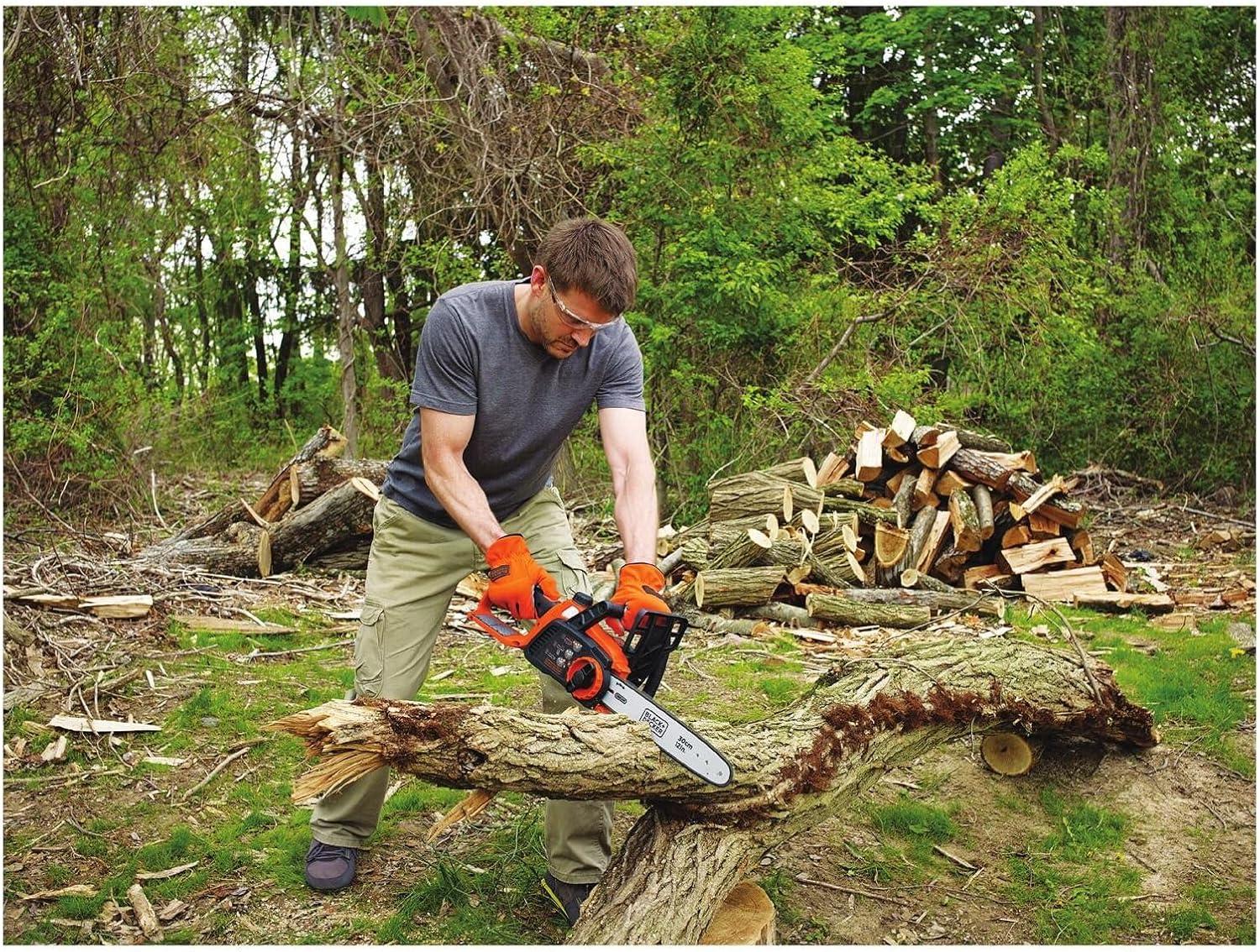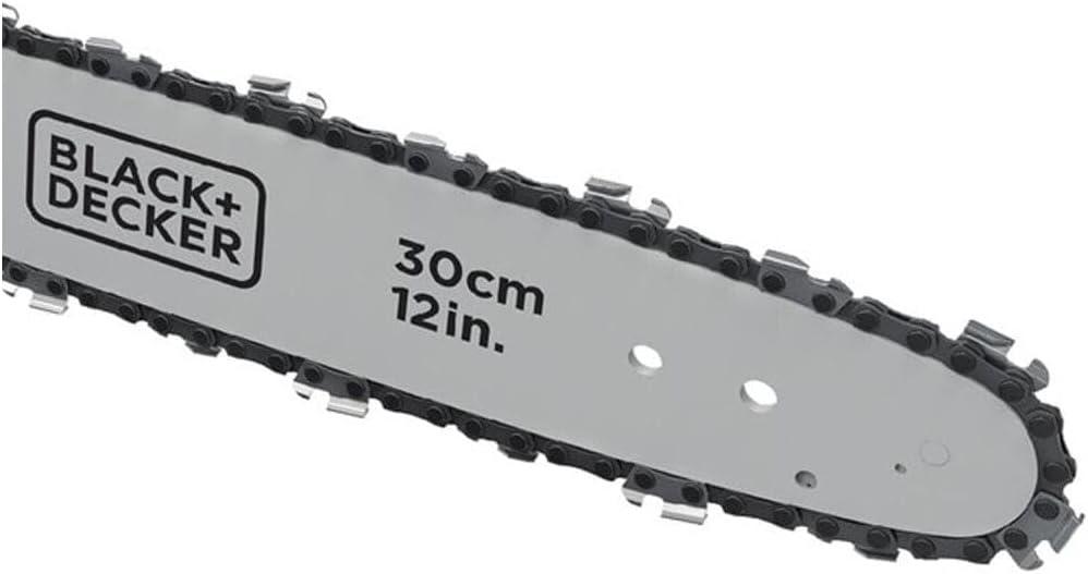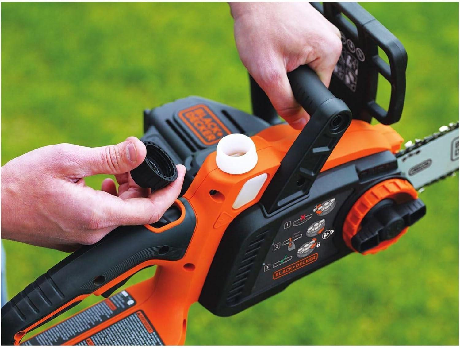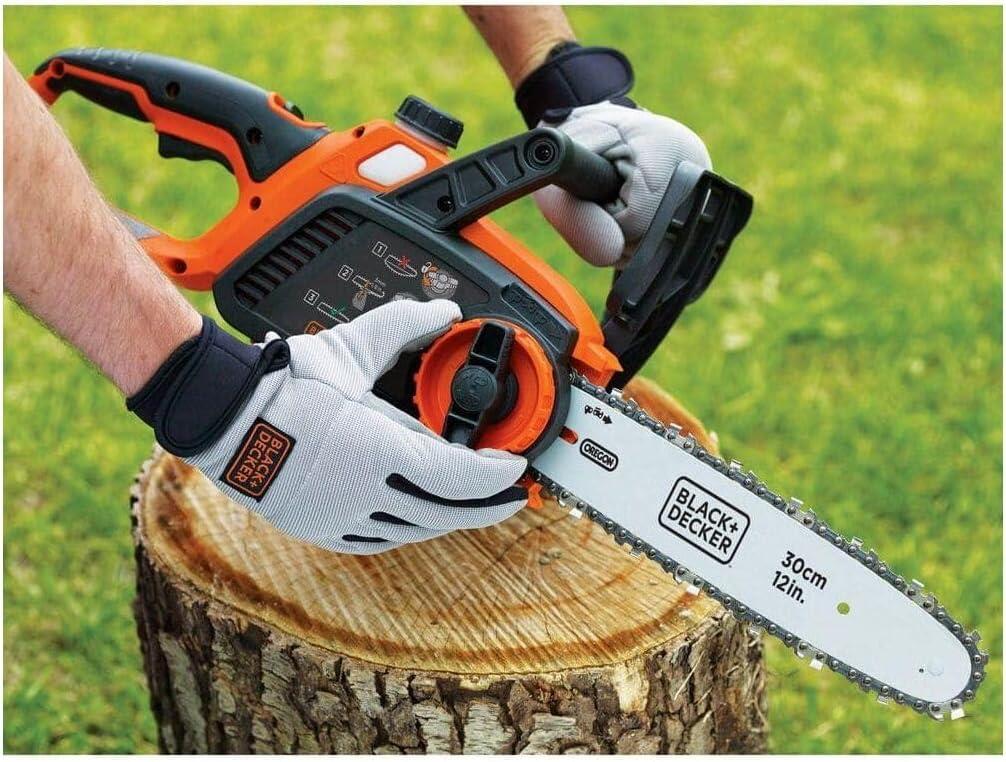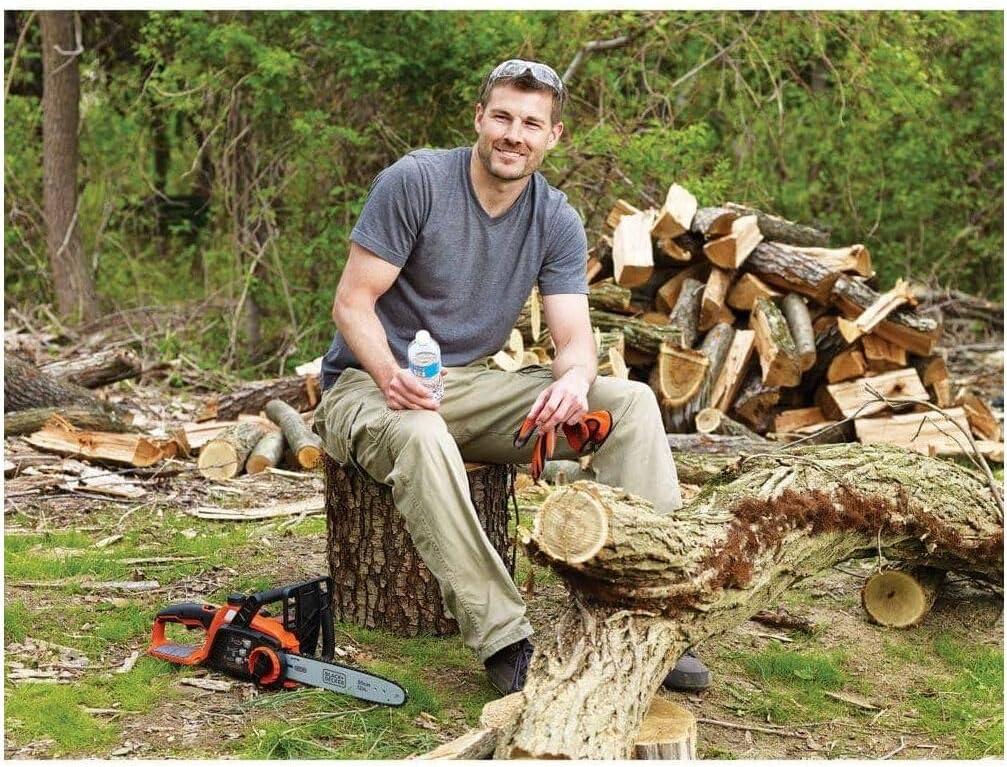 Whether you're tackling routine yard maintenance or a big creative project, you know only the best tools will do. BLACK+DECKER’s 40V MAX* cordless chainsaw offers power and convenience. Don't be fooled by this battery-operated chainsaw’s lightweight maneuverability—on a full charge, it can power through an average of 60 4×4 pine lumber cuts before you’ll need to recharge (battery not included). Thanks to a wraparound grip handle for increased versatility, you’ll even be able to use this chainsaw in angled orientations. A 12 in. OREGON low-kickback bar and chain allow for smooth, fast cuts, while tool-free chain tensioning ensures seamless adjustments. This chainsaw is also equipped with an automatic oiling system, so that lubricating the bar and chain is simple and straightforward. Design elements like a front hand guard and a lock-off button put your safety at the forefront, and when you're not using your chainsaw, the guide bar scabbard protects the blade. *Maximum initial battery voltage (measured without a workload) is 40 volts. Nominal voltage is 36 volts.