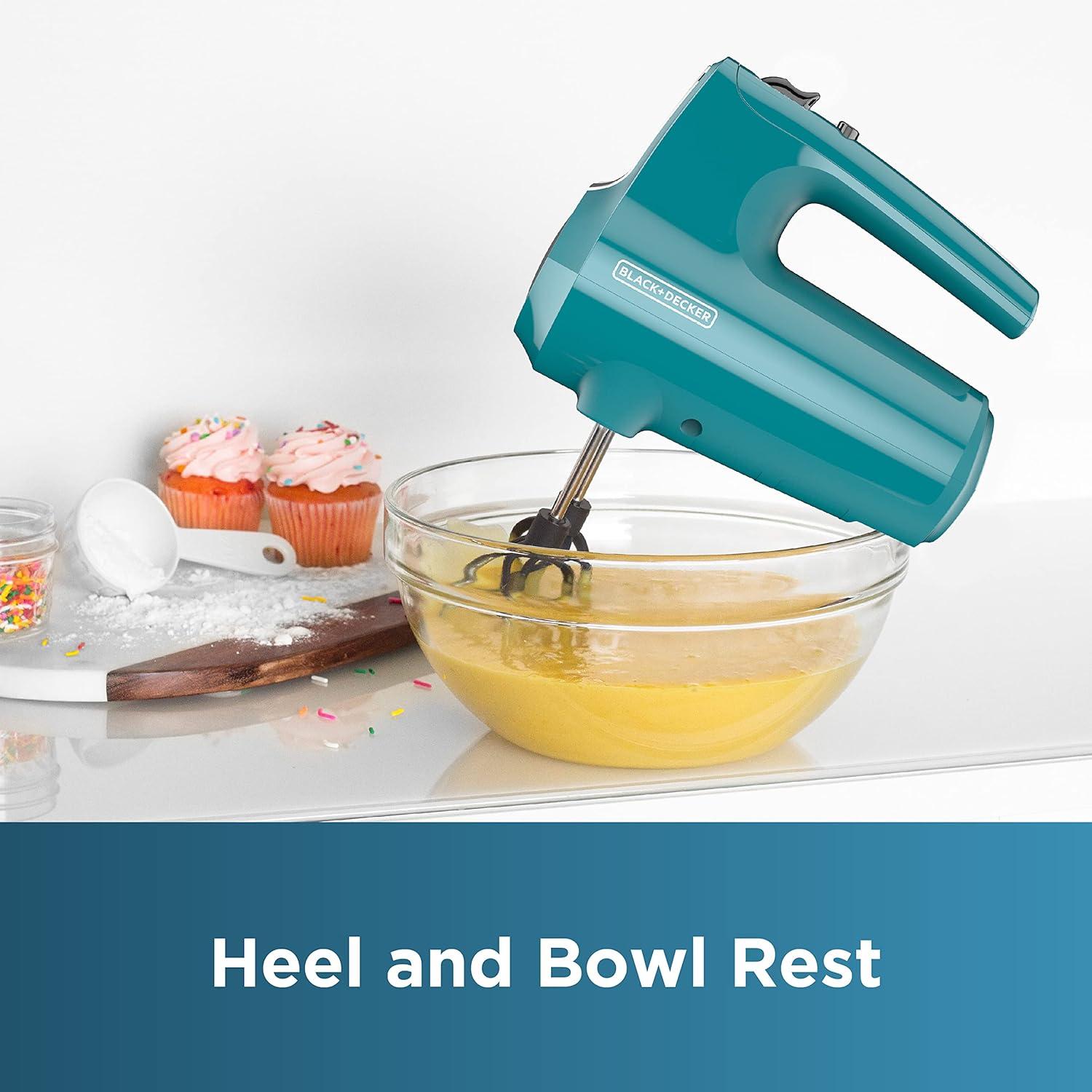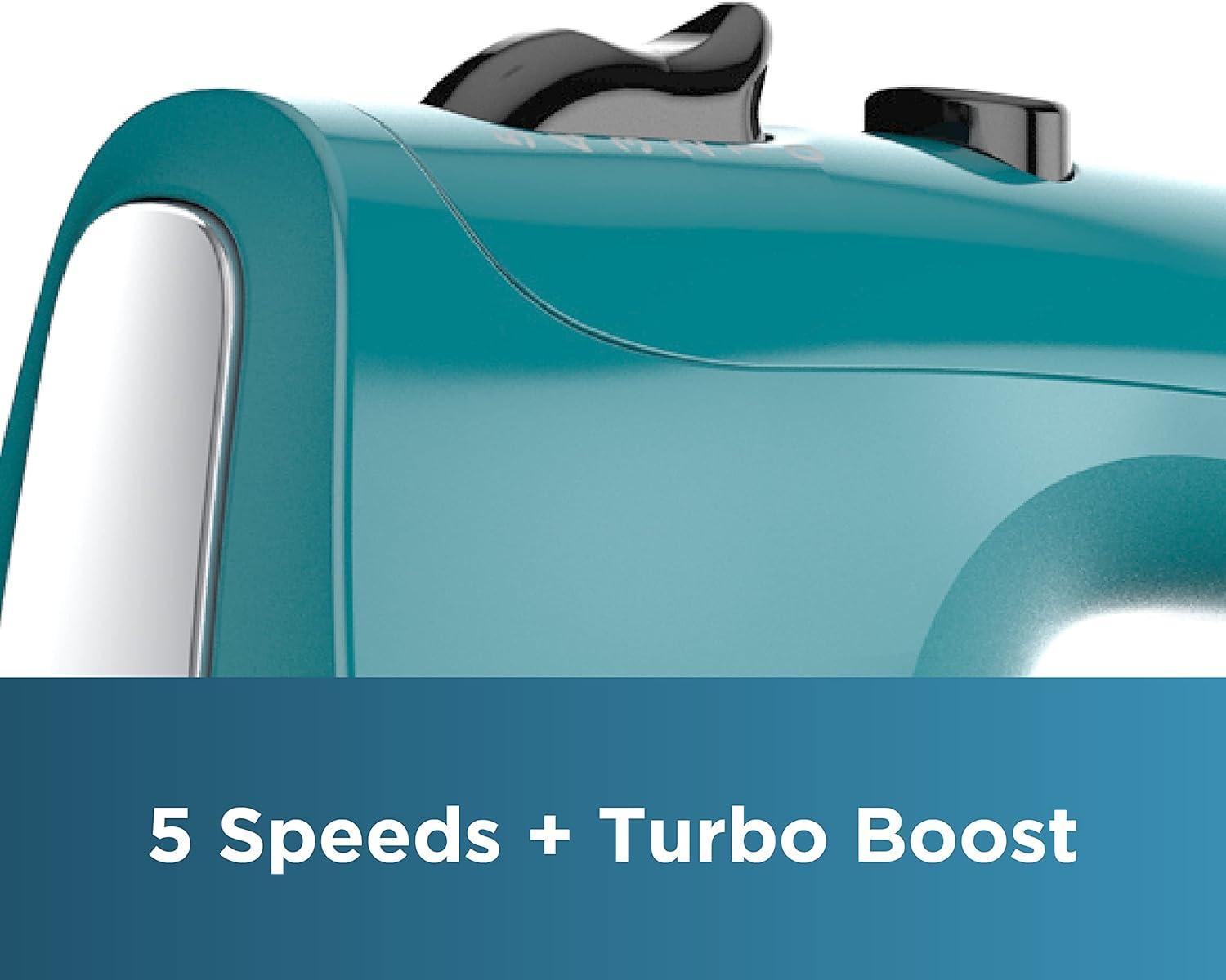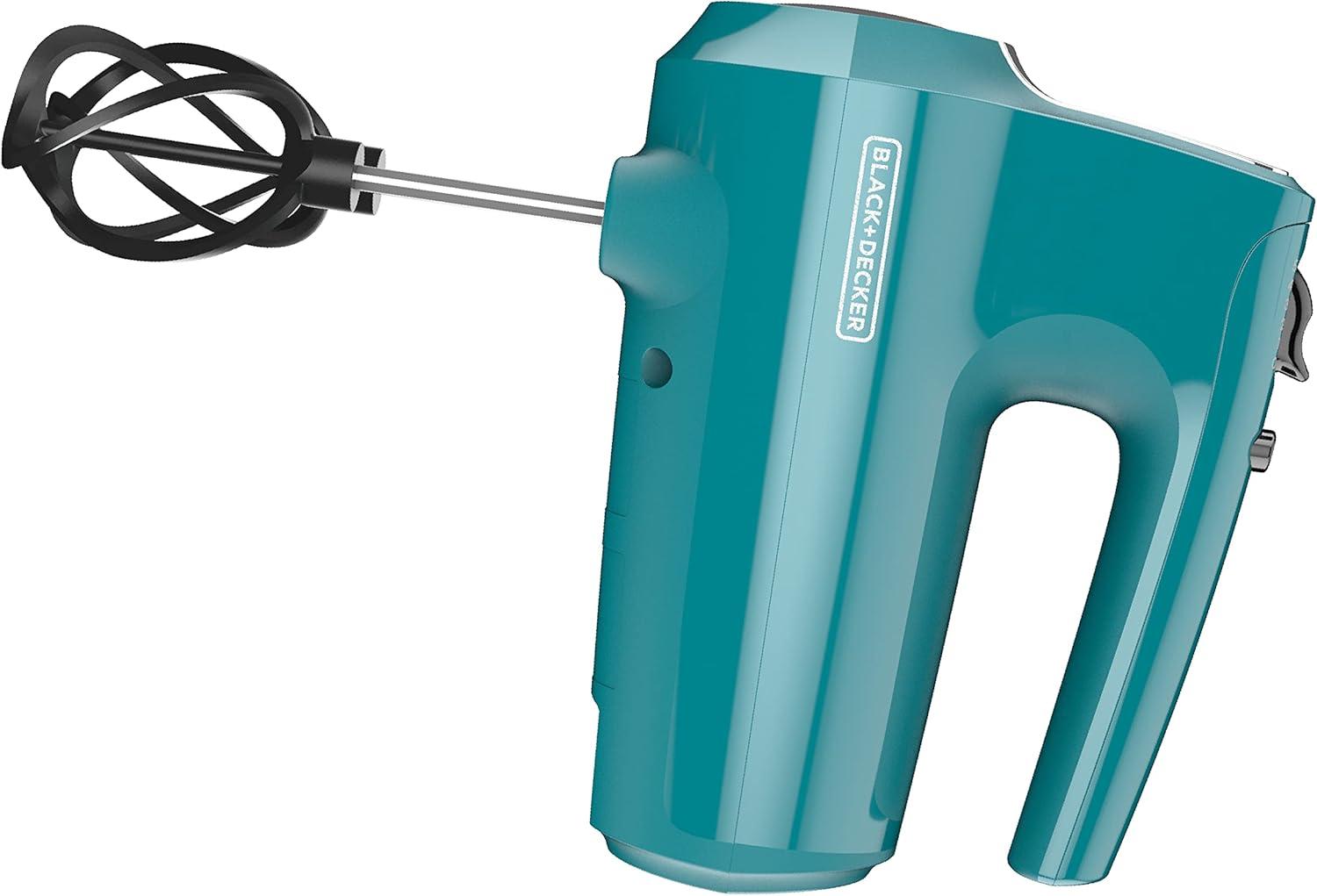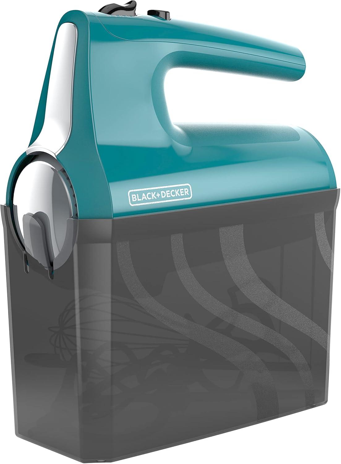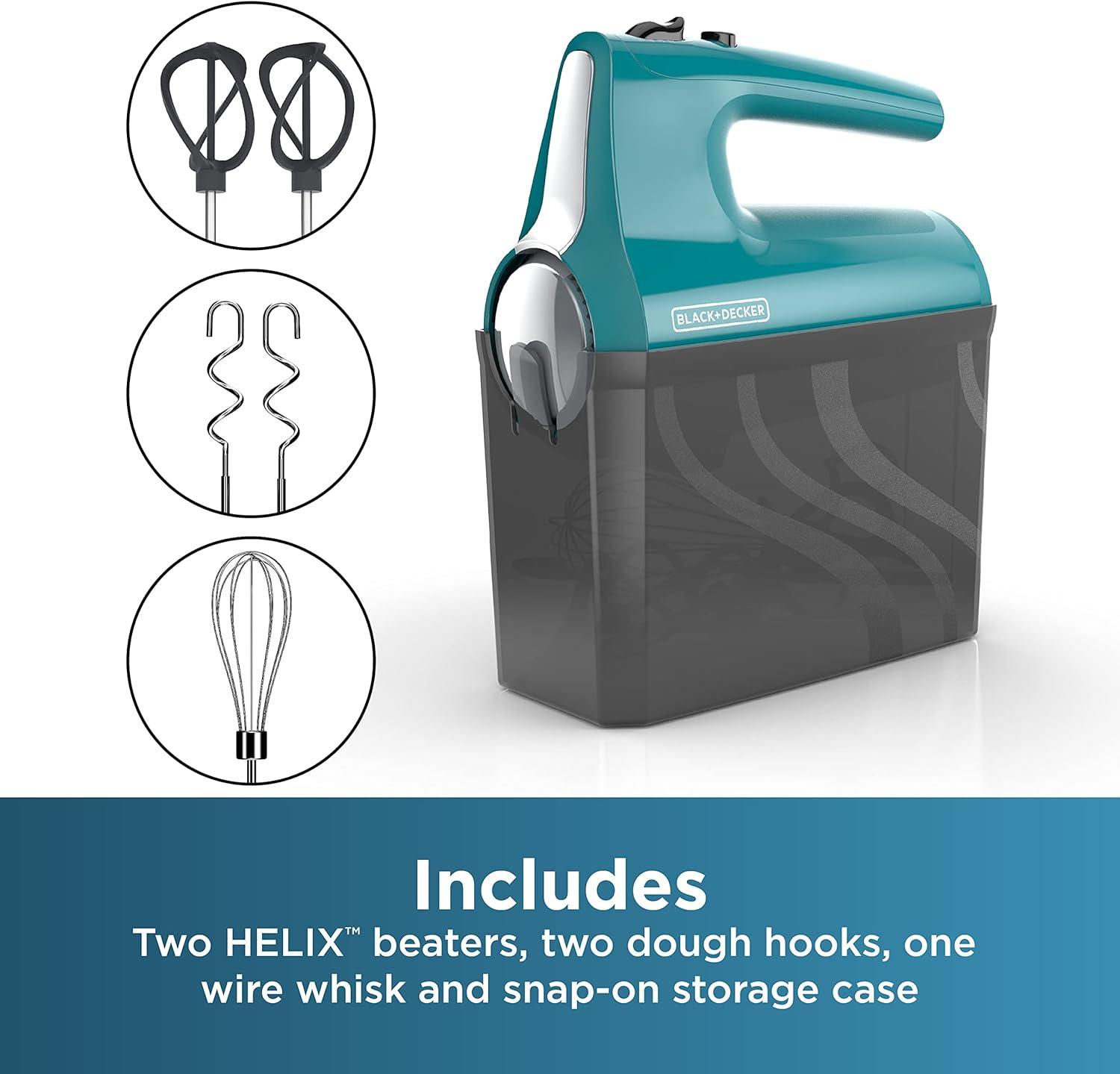 BLACK+DECKER 5 Speed Electric Hand Held Mixer, HELIX beaters, Whisk, and Dough Hook Attachments, Turbo Boost, Snap-On Storage Case(Teal)