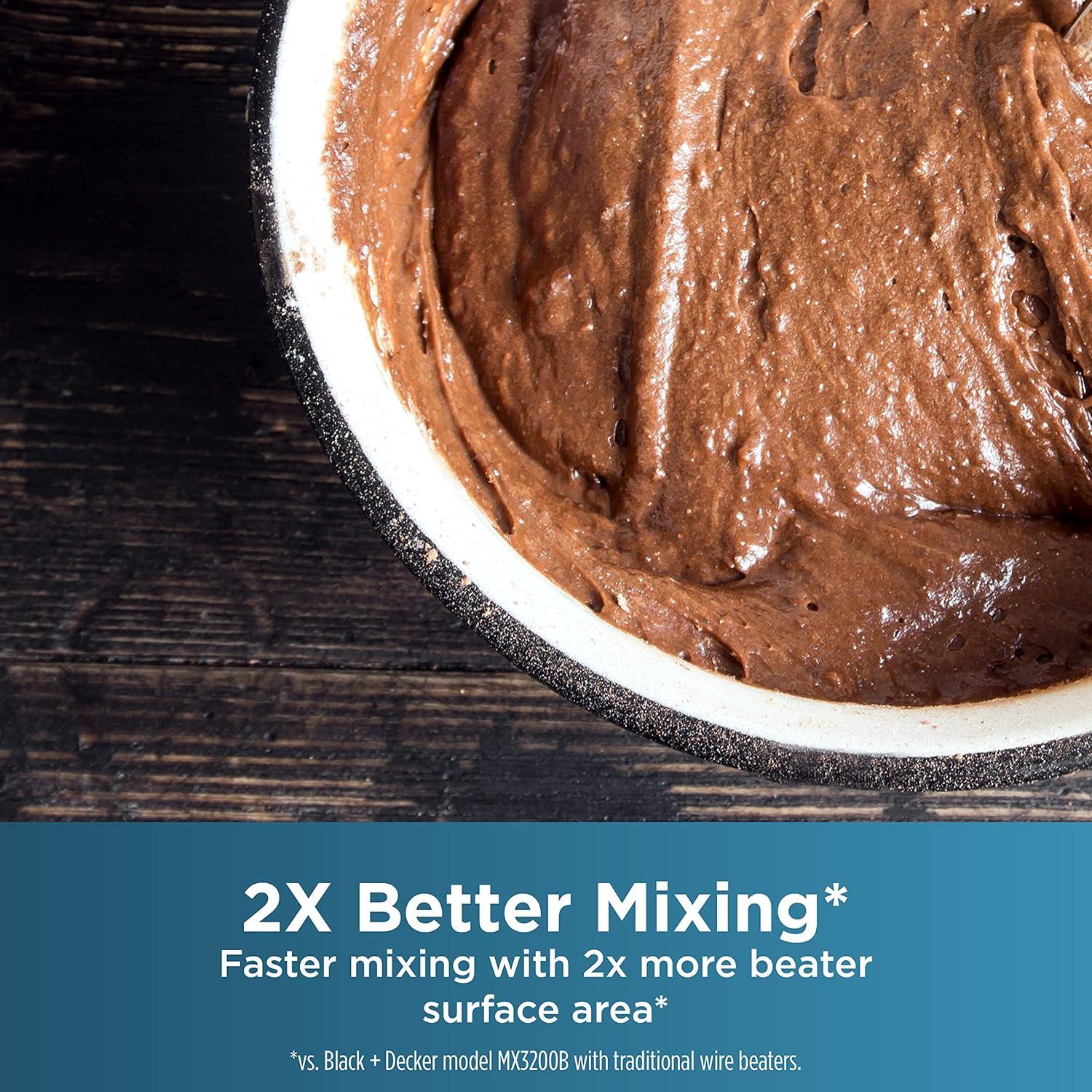 Premium design from BLACK+DECKER™. The advanced helix design improves mixing performance* by maximizing beater overlap and mixing ingredients in multiple directions. The BLACK+DECKER Helix Performance Premium Hand Mixer features reinforced nylon beaters with 2x the surface area* and 2x the mixing performance*. With 350 watts of power at peak performance** runs at five speeds, including a reduced* starting speed to help prevent splatters. Plus, a special turbo boost adds a power boost at every mixing speed to combine thick ingredients in no time. This set includes two helix beaters, two dough hooks, and one wire whisk; allowing you to quickly create cake and cookie batters, bread doughs, spreads and dips, homemade whipped cream, or whipped egg whites for a tasty meringue. All accessories are stored conveniently in the smartly designed storage case, which uses the mixer itself as the snap-on cover. Cleanup is a breeze with the auto-eject button that quickly disconnects the dishwasher-safe mixing tools. Plus, you can further prevent messes with the heel and bowl rest, which allows the mixer to sit upright on the edge of the bowl. *compared to BLACK+DECKER model MX3200B with traditional wire beaters **Peak power refers to the maximum power recorded for 100ms during blending.