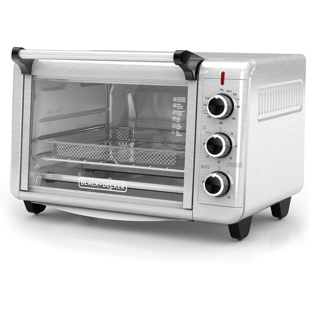 Introducing Air Fry Technology, new in the BLACK+DECKER Crisp 'N Bake Air Fry Toaster Oven. This is deep fried taste without the fat! Air Fry Technology uses high intensity hot air to bake, brown, and crisp your favorite fried foods with little to no oil. Try French fries, veggie chips, breaded fish filets, frozen snacks, and a lot more! There’s space for up to six slices of bread or a 12” pizza. Three control knobs make it easy to set the toast timer and 60-minute timer, and choose from five cooking functions: bake, broil, toast, keep warm, and air fry. Convection technology circulates air within the oven for fast and even results when air frying. Plus, this toaster oven includes an air fry basket, bake/broil pan and rack, and an external crumb tray that slides in and out to make cleanup a breeze.