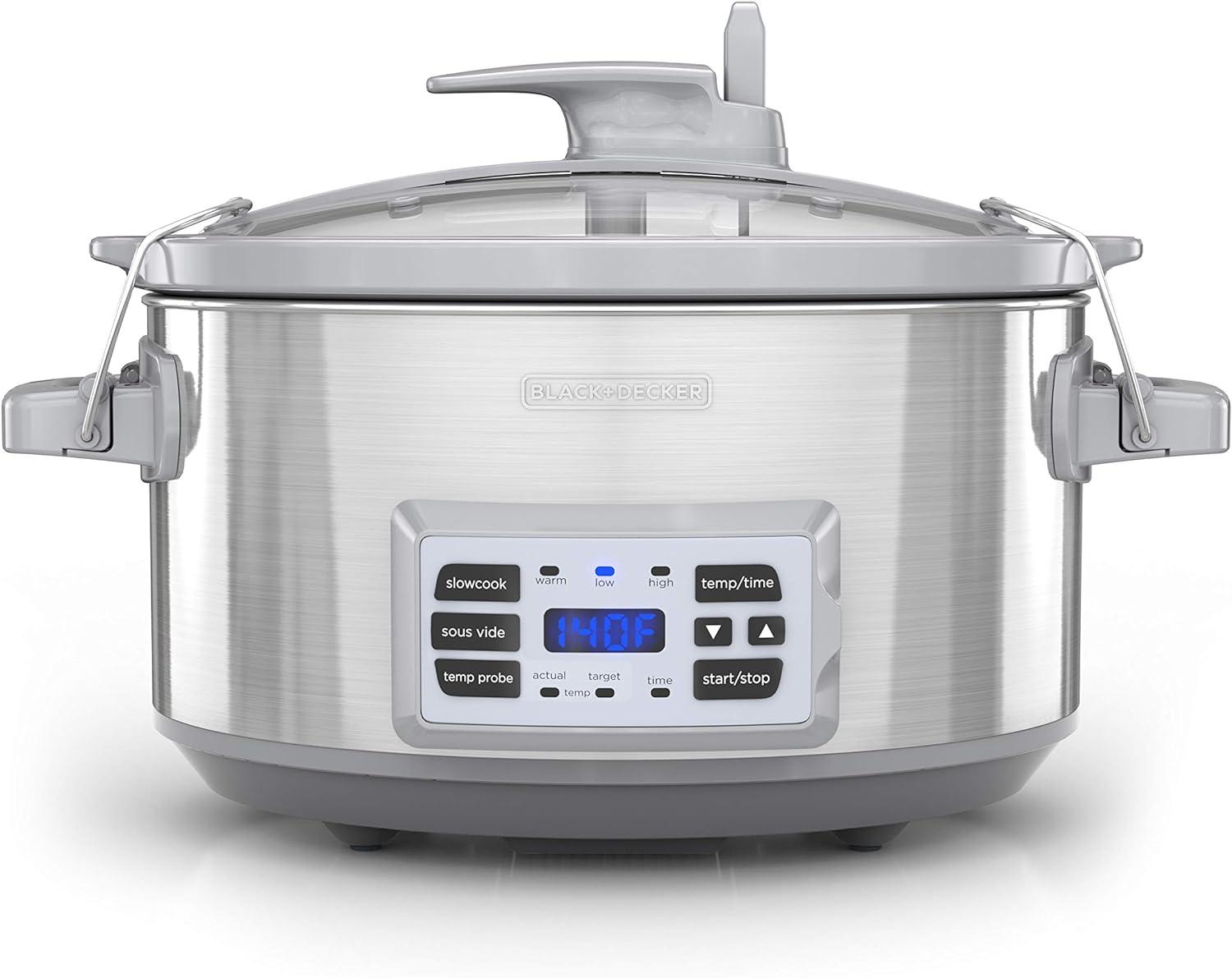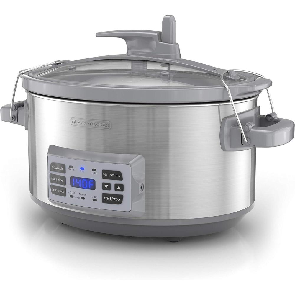 The BLACK+DECKER 7-Quart Digital Slow Cooker with Temperature Probe + Precision Sous-Vide gives you three ways to cook 1 ) Classic slow cooking is simple in the 7-quart stoneware crock Just add in the ingredients and let the low constant heat go to work on roasts soups chilis and so much more! 2 ) Use the temperature probe to achieve ideal results on a variety of proteins Just set the desired temperature insert the probe into the meat and the slow cooker will do the rest 3 ) For restaurant-quality results without the hassle or guesswork use the Sous-Vide Function Just arrange single servings of food inside the resealable bags set the time and temperature based on what you’re cooking and the level of doneness you prefer and then insert the temperature probe into the water The sous-vide method helps prevent overcooking by heating the water that surrounds the food bringing it to the desired internal temperature When slow cooking three heat settings give you options to find the best temperature for your schedule—Low for 8-9 hours of cooking High for 3-4 hours and Warm for keeping food at the ideal serving temperature Plus cleanup is easy thanks to the dishwasher-safe stoneware pot and tempered glass lid