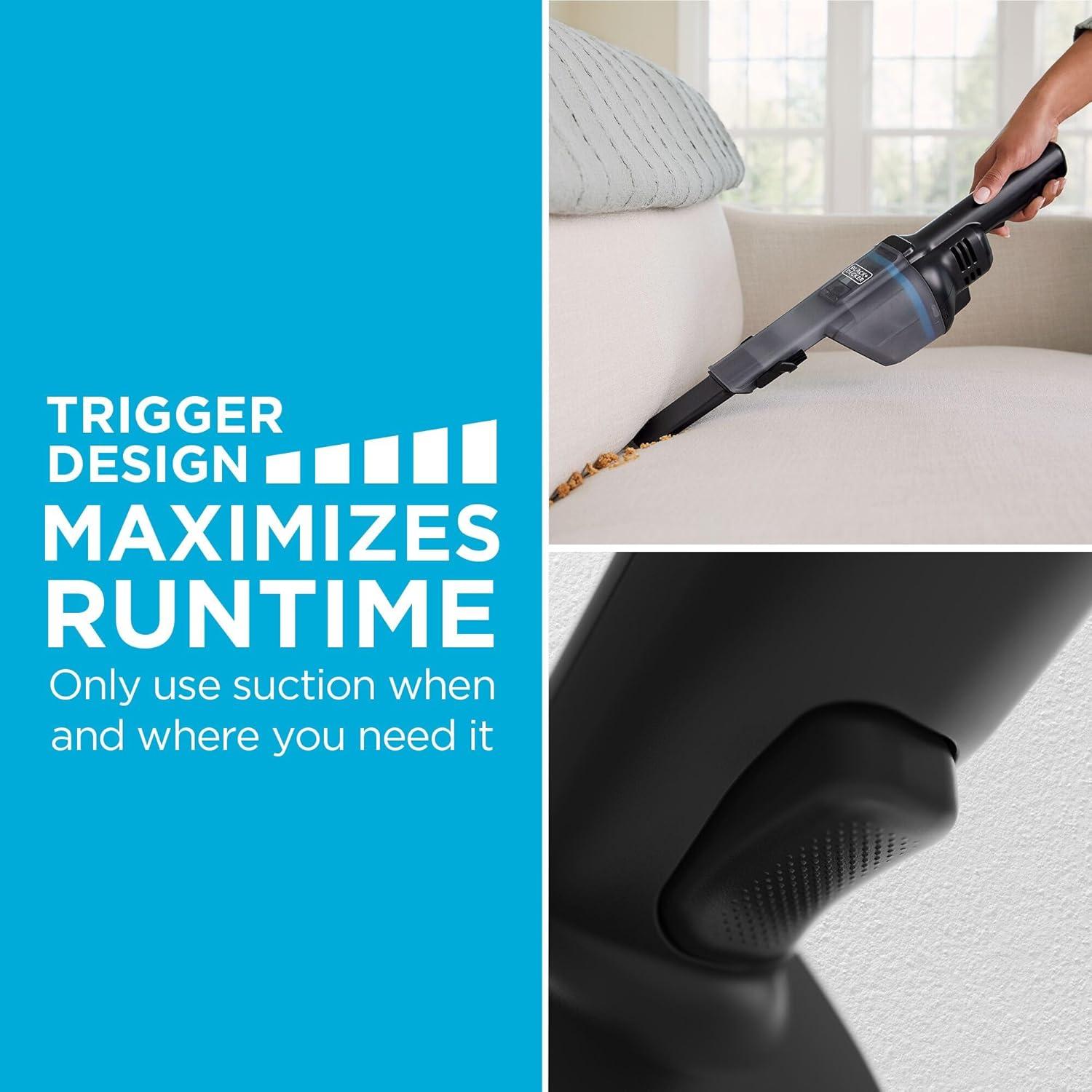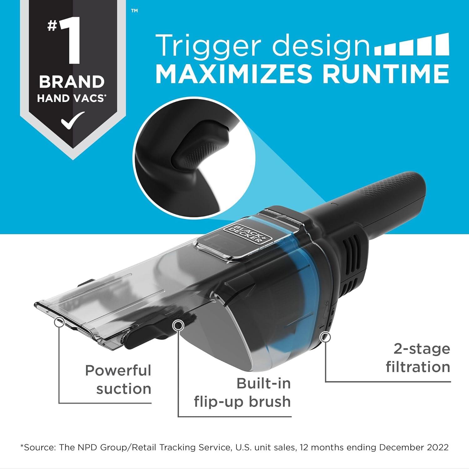 Make cleaning easy with the lightweight and portable BLACK+DECKER® dustbuster blast Cordless Hand Vacuum. The convenient trigger design allows you to release the power when moving from spill to spill, maximizing runtime and only using suction when and where you need it. Capture large and small debris with the enhanced filtration, and use the crevice tool to clean hard-to-reach spaces with ease.