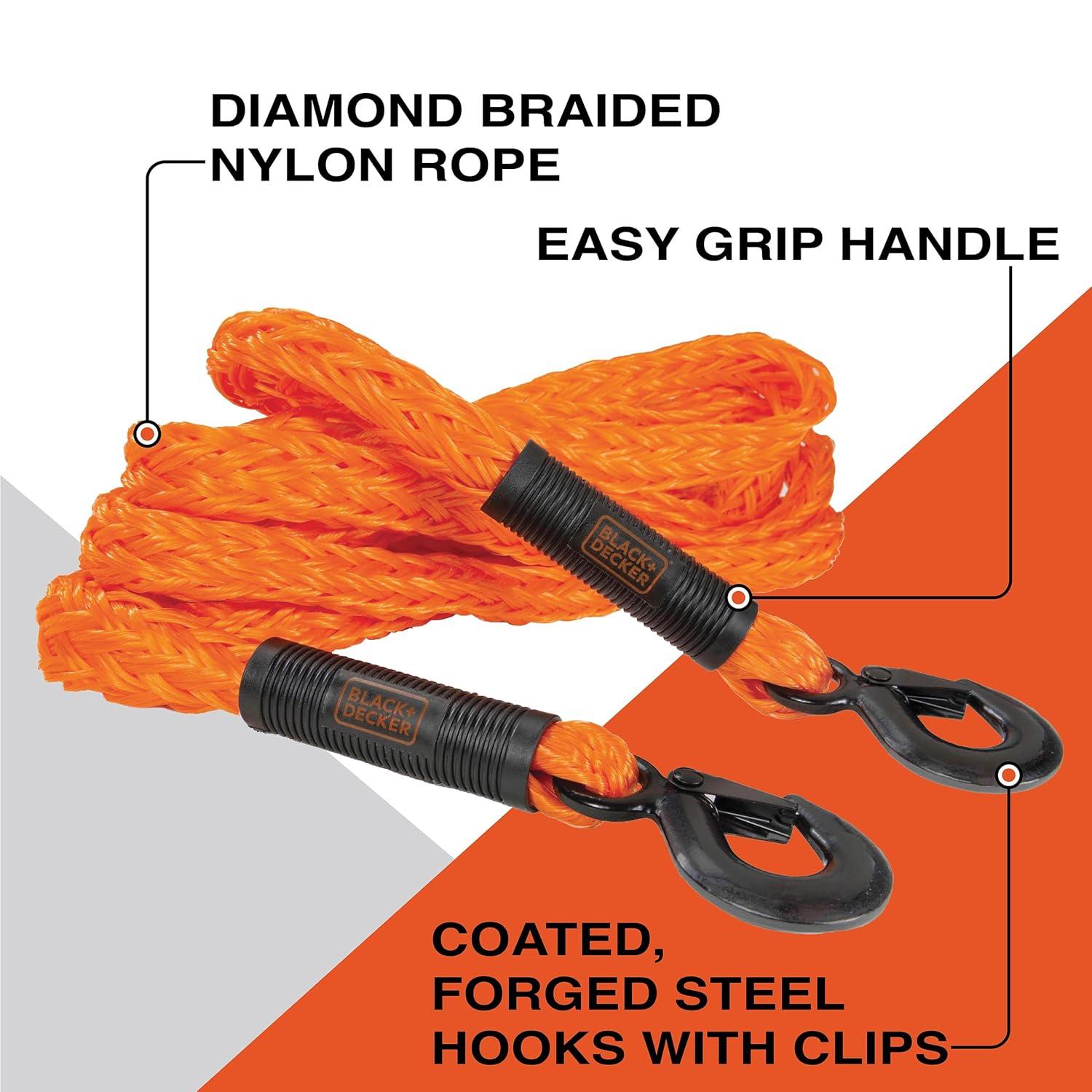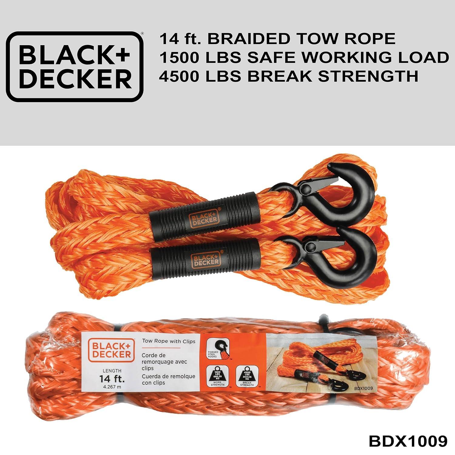 BLACK+DECKER BDX1009 Black/Orange 14' Tow Rope with Easy Grip Handles and Steel Forged G-Clip Hooks (4,500 lb Break Strength)(Tow Rope)