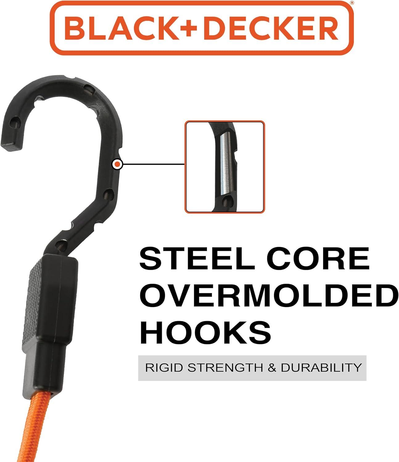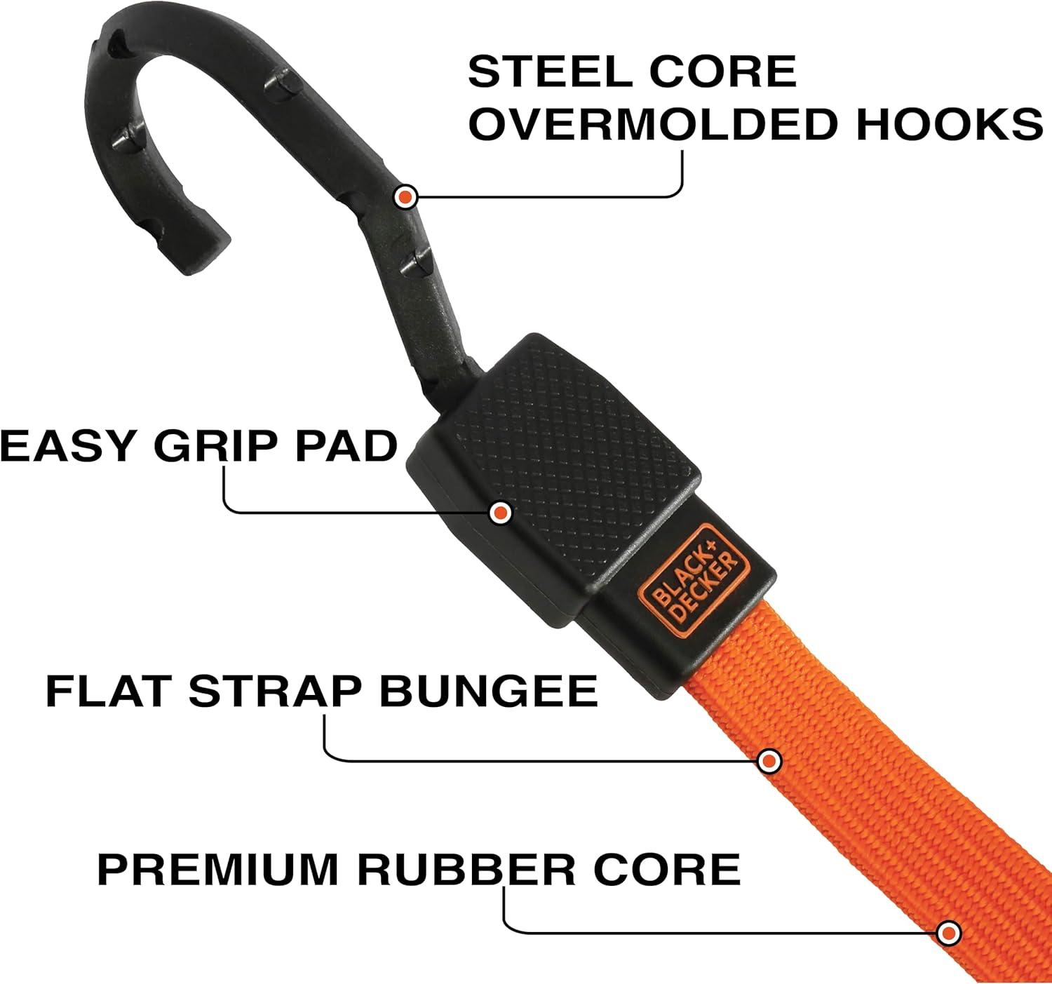 BLACK+DECKER Flat Bungee Cords make securing items and loading easy. The flat design prevents sliding and increases safety and stability. Coated steel core hooks with an easy grip pad provide durability and cargo protection. Includes two 24″ flat bungee cords.