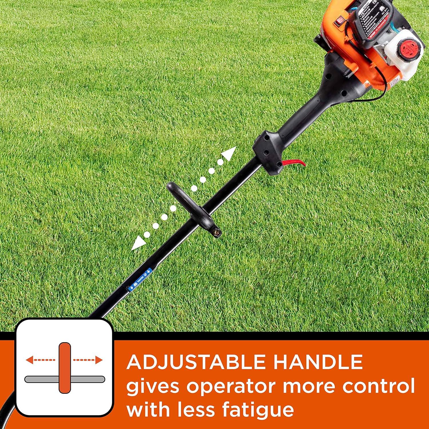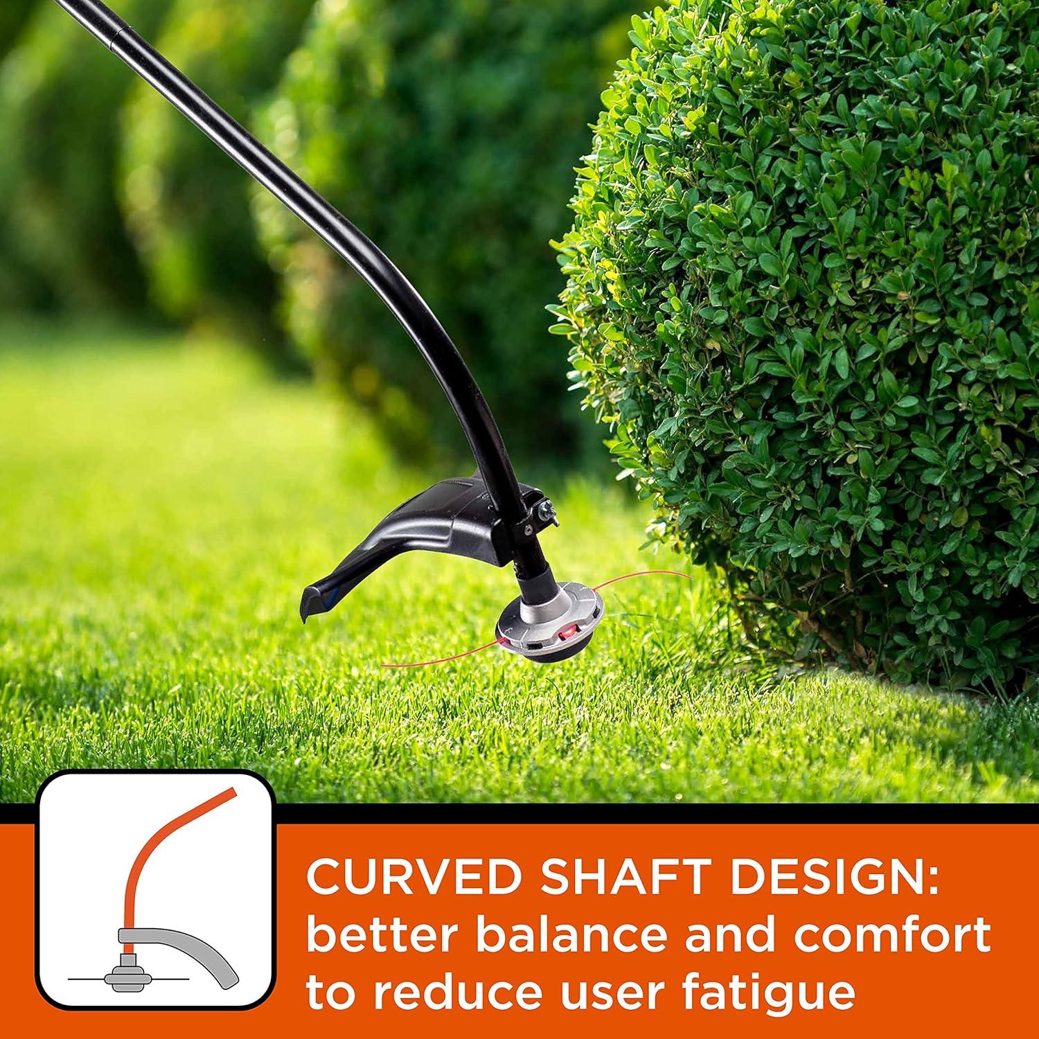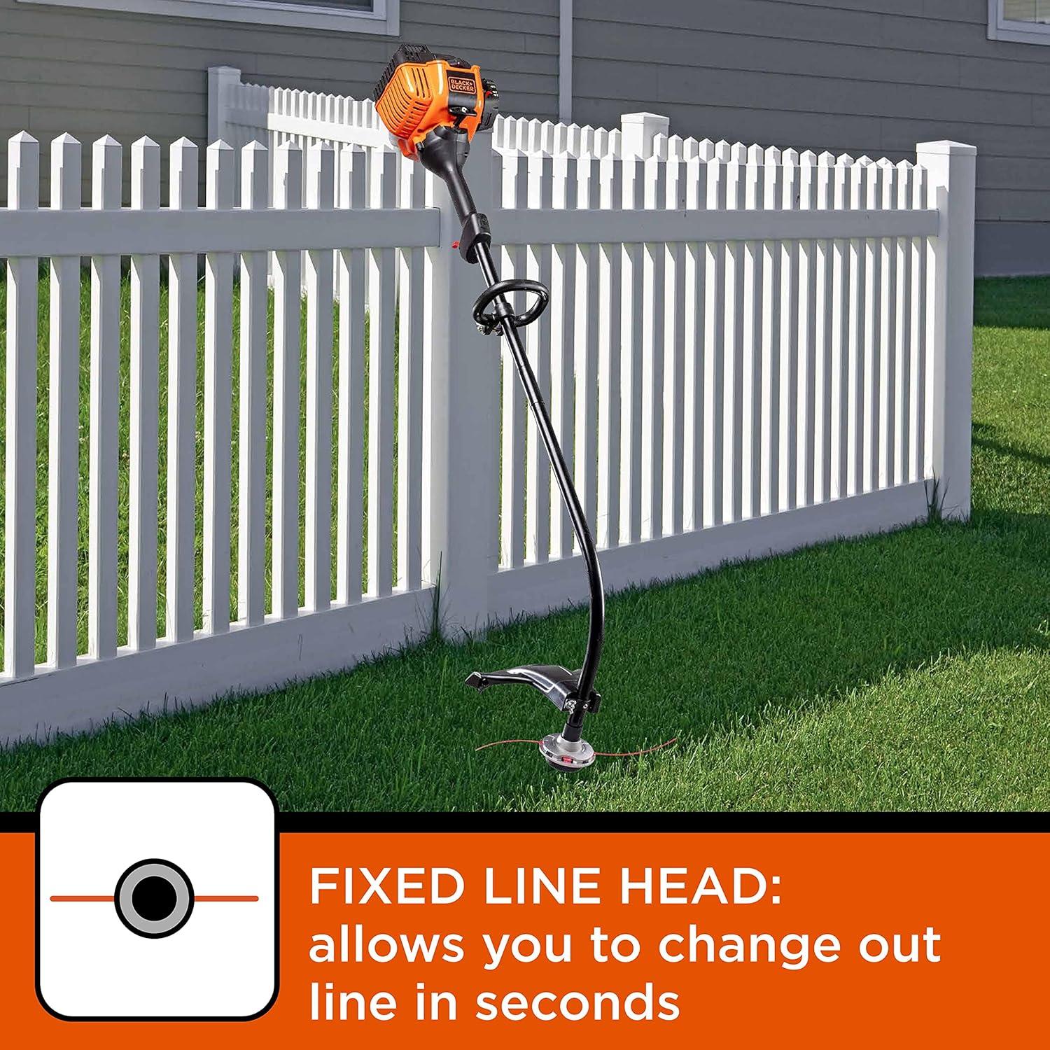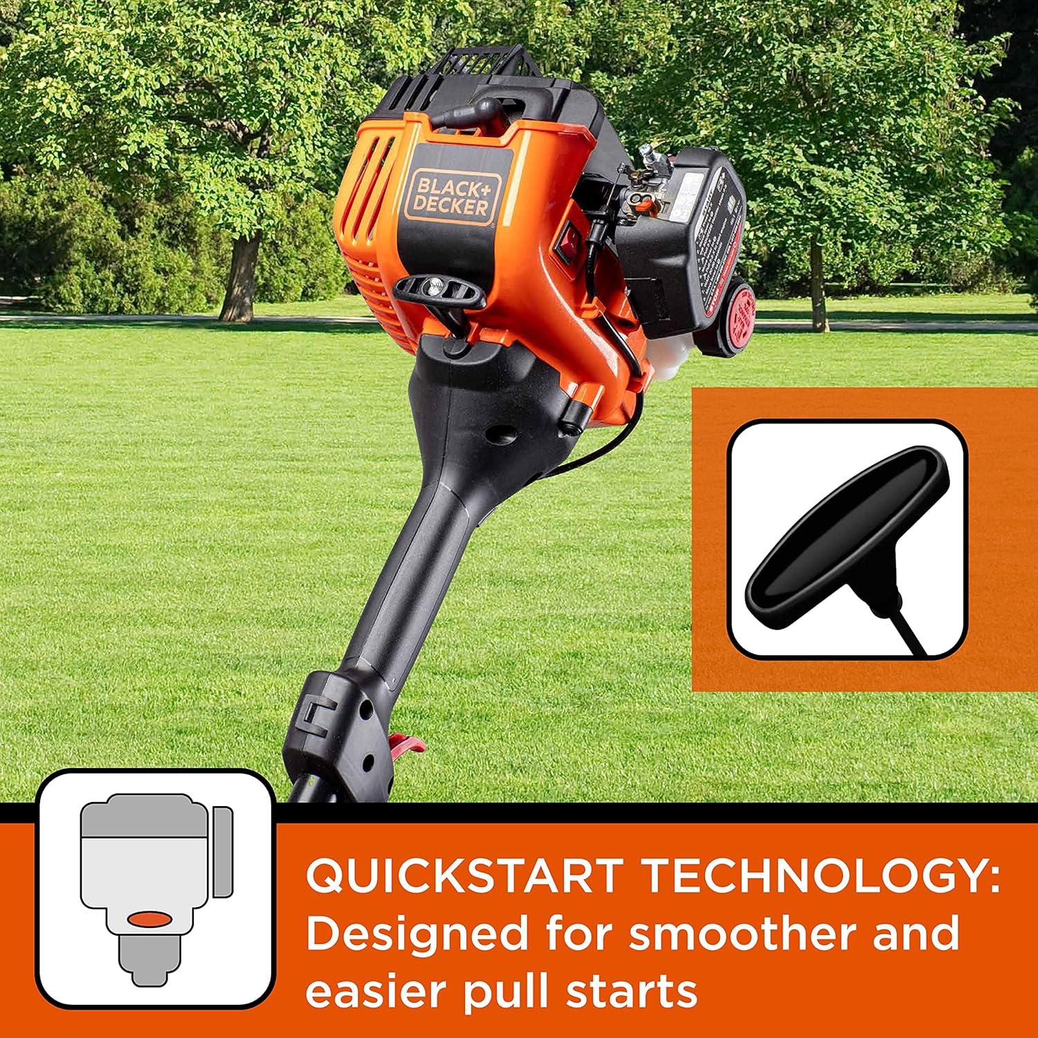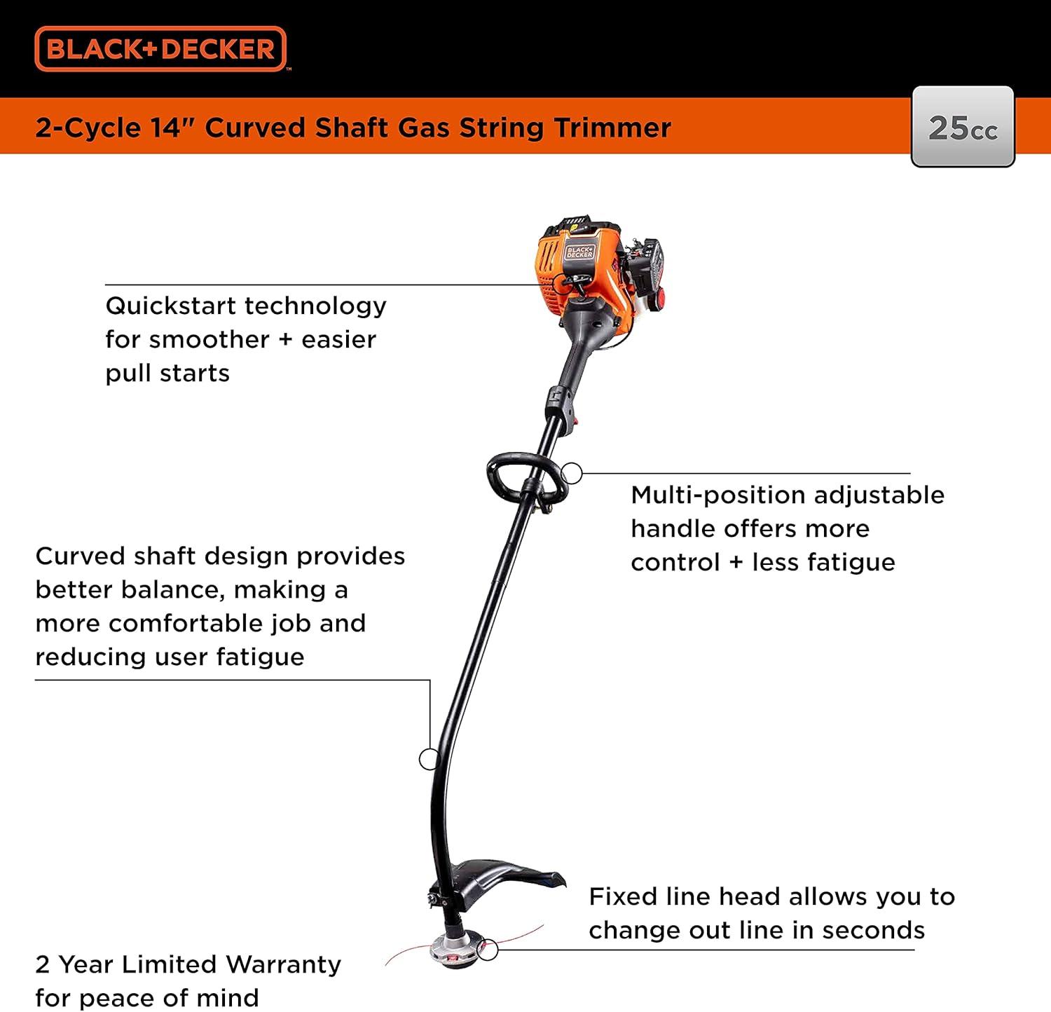 The lightweight BLACK+DECKER BDXGTAM214101 trimmer has a 25cc 2-cycle engine with QuickStart technology, which reduces the effort it takes to pull start the engine. The ergonomic curved shaft design makes it easy to trim small to medium yards with less fatigue. The 14-inch cutting swath makes it easy to trim a wide area of grass. Replace trimmer line with ease by tapping the cutting head on the ground while operating. Keeping stubborn vegetation in check is one of the best ways to achieve a great looking yard. BLACK+DECKER has hard working trimmers to help you achieve a well-manicured lawn with minimal effort. The BLACK+DECKER trimmer is ideal for small to medium sized yards. It is lightweight, powerful, and easy-to-use. The BXGST225CS Curved Shaft trimmer offers optimal comfort while cutting, and a direct view of the cutting line while operating.