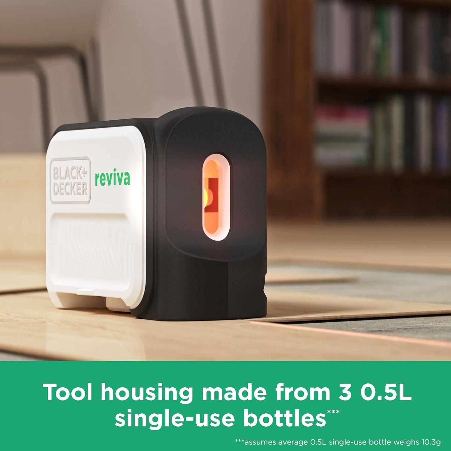The reviva™ Laser Level's tool housing is made with Tritan™ Renew from Eastman 50% certified recycled material in an amount equivalent to the weight of 3 single-use 16.9 fl oz plastic bottles. The compact design and 360-degree rotating base helps to make it easy to position the laser level when hanging decorative items. This tool projects a red line up to 15 ft working range for easy measuring and marking. The laser level is great for household projects such as hanging wall art and frames, installing tile, and painting or stencelling lines.