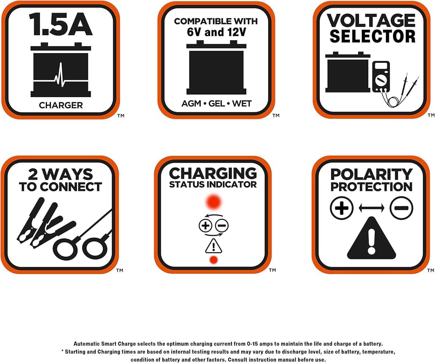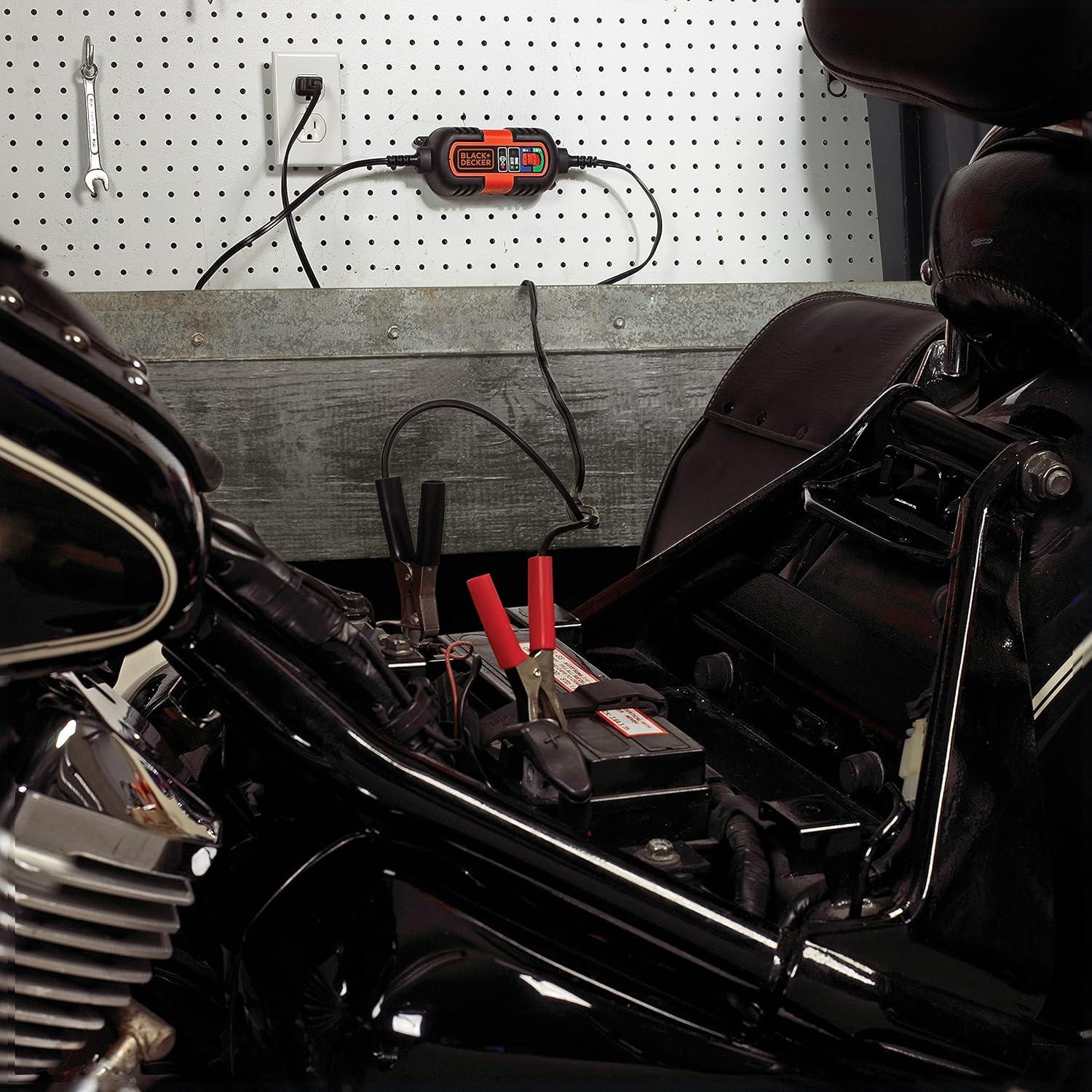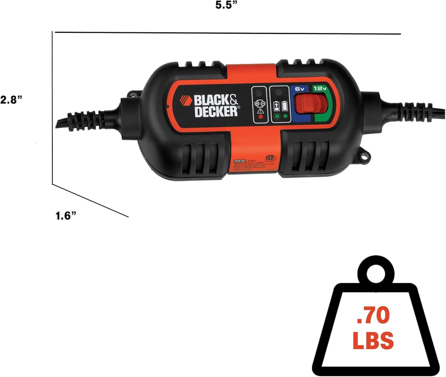 This Black and Decker Battery Maintainer and Trickle Charger will work with both 6-volt and 12-volt batteries. It is ideal for battery maintenance, charging RVs, specialty vehicles, antique and classic cars, motorcycles, lawn mowers, tractors, ATVs, snowmobiles, personal watercraft and more. There are two LED indicators—a red one for fault and a green one to show charge status.