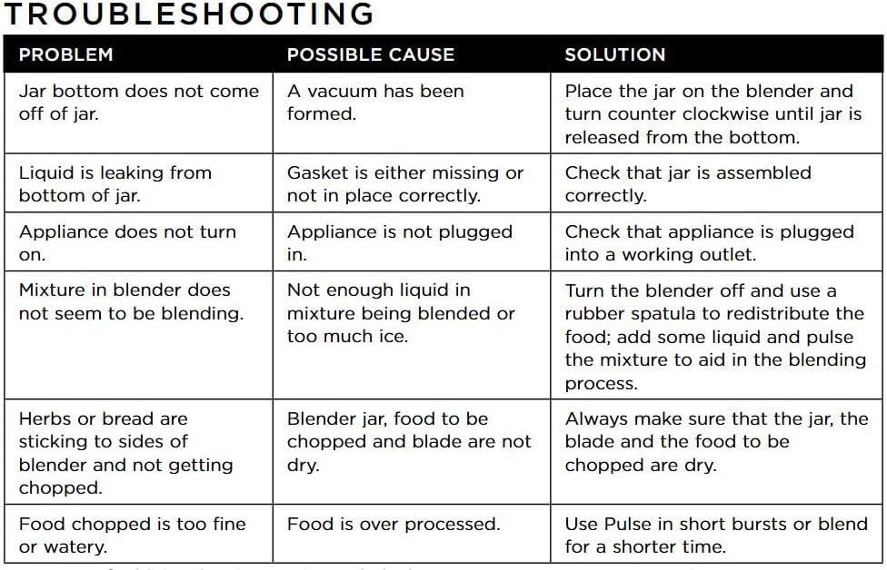 TROUBLESHOOTING MADE EASY: Designed for ease of use, your blender includes a helpful troubleshooting chart in the user manual offering quick tips for common issues like blending consistency or setup, helping you enjoy smooth results every time