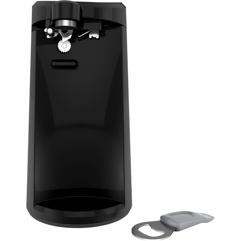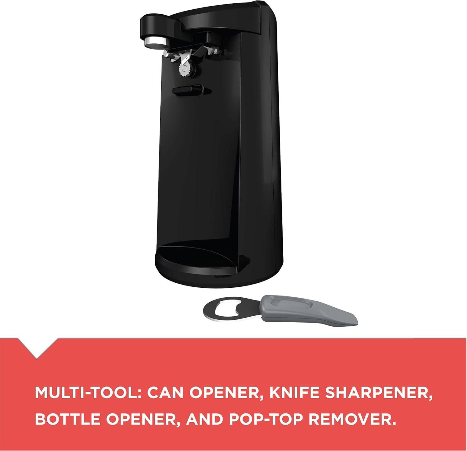 Simplify everyday kitchen tasks with the BLACK+DECKER EasyCut Extra-Tall Can Opener. The tall, wide design accommodates most can sizes, and the EasyCut Blade Technology easily pierces cans for fast lid removal. The unit includes a built-in knife sharpener and a multi-tool that removes bottle caps and pop-tops. In one compact device you get: can opener, knife sharpener, bottle opener, and pop-top remover.