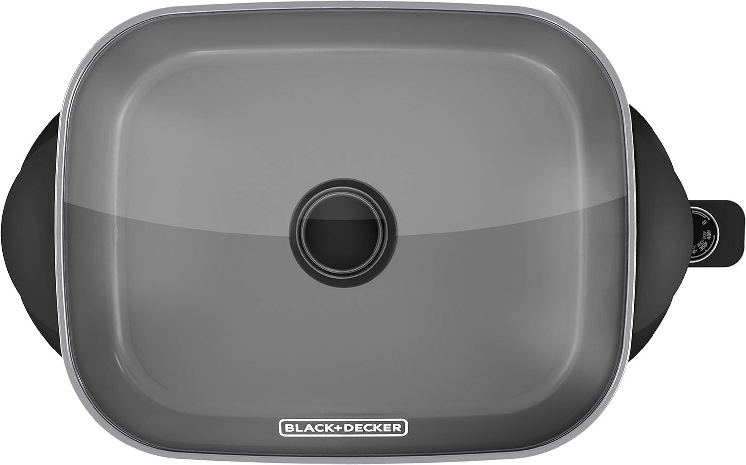 Product Description Black & Decker Skillet features a large cooking area and deep interior for healthy cooking for the whole family. Go from kitchen to dinner table with the quick-release variable temperature control and cool-touch handles – perfect for table serving. Excess fat is removed with the pan tilt leg to move oil and fats away from whatever you're cooking. Features include a 12″ x 15″ cooking surface with durable nonstick coating for easy clean up, removable variable temperature control ranges from keep warm to 400 degrees F, dishwasher safe base, cool-touch base with serving handles, tempered glass lid. Brand Story By BLACK+DECKER