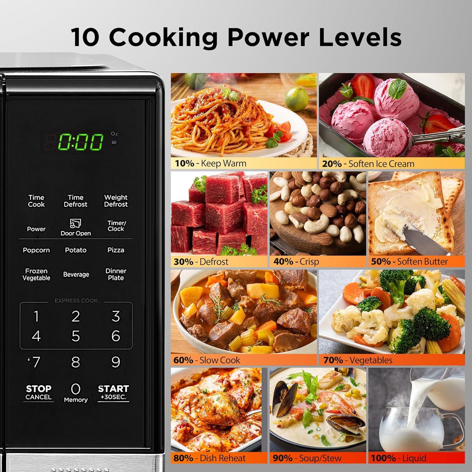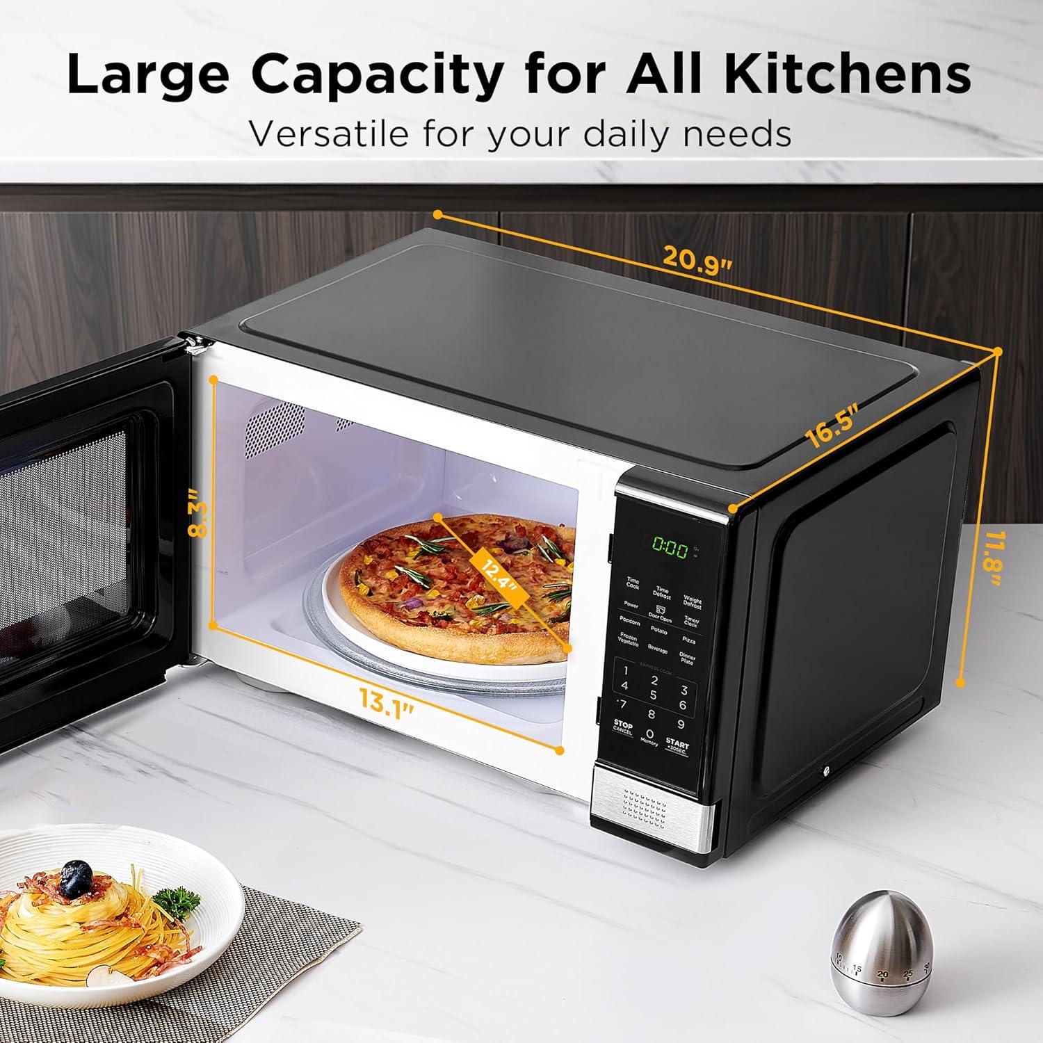 Large LED digital display, easy-to-read control panel, child safety lock, interior light, removable 12.4” glass turntable
