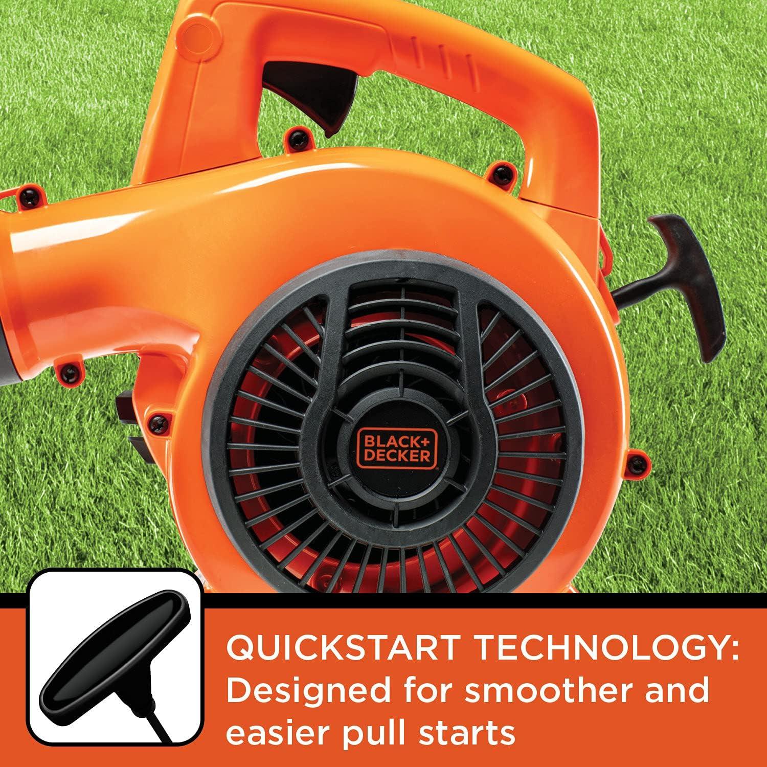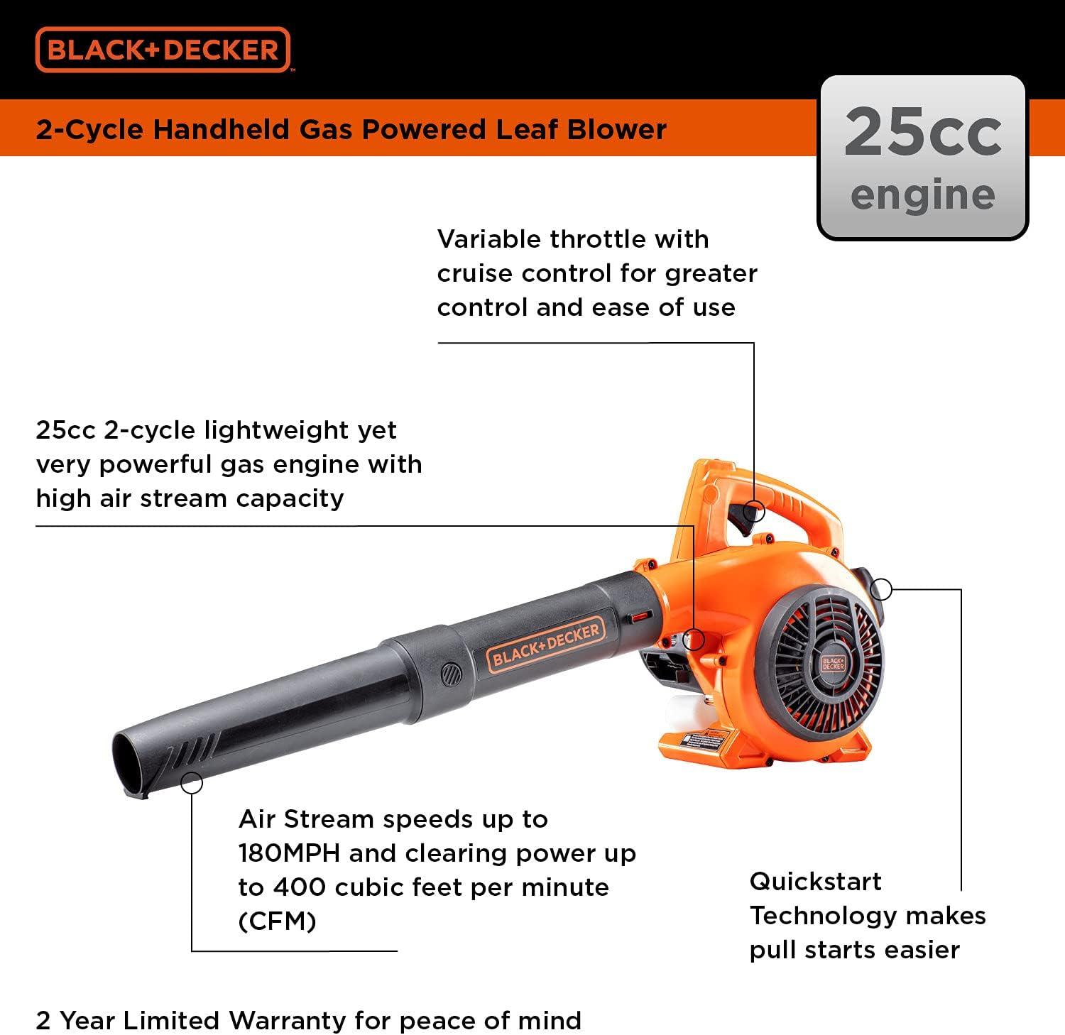 Blustery summer storms and falling leaves are no match for the BLACK+DECKER BXGBL225 25cc gas blower. For comfortably blowing leaves and debris from yards and hard surfaces, this BLACK+DECKER blower features blowing speeds up to 180 mph and clearing power of up to 400 cu. ft. per minute (CFM). This BLACK+DECKER model features a 25cc 2-Cycle Gas Engine for more consistent, dependable power and a lighter weight to combat user fatigue until the job is done. The variable speed throttle provides enhanced control over performance, directing air flow at your preferred speed and compact tubes allow for easy handling. This handheld, cordless mower will help you effectively and efficiently complete any lawn care task.
