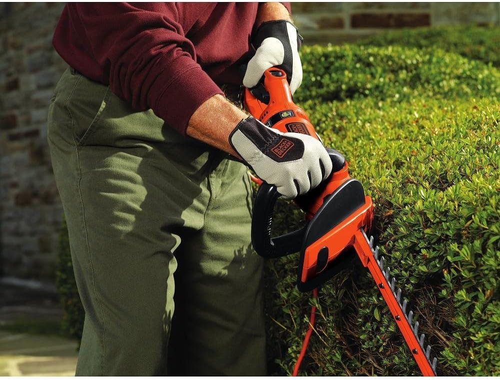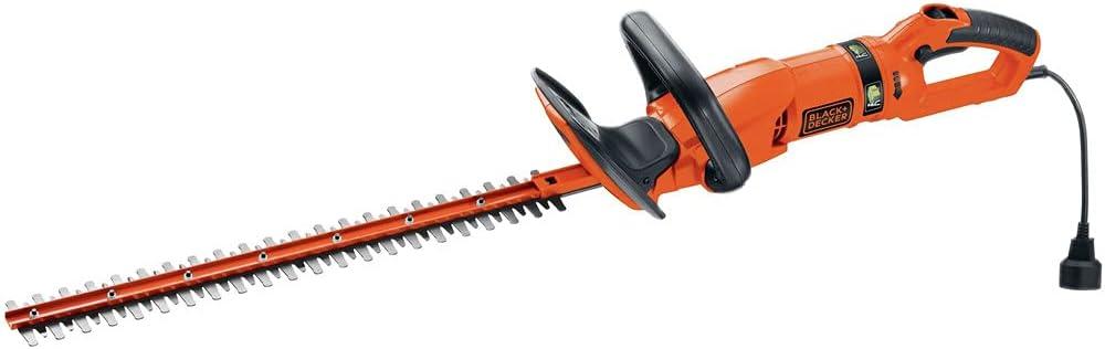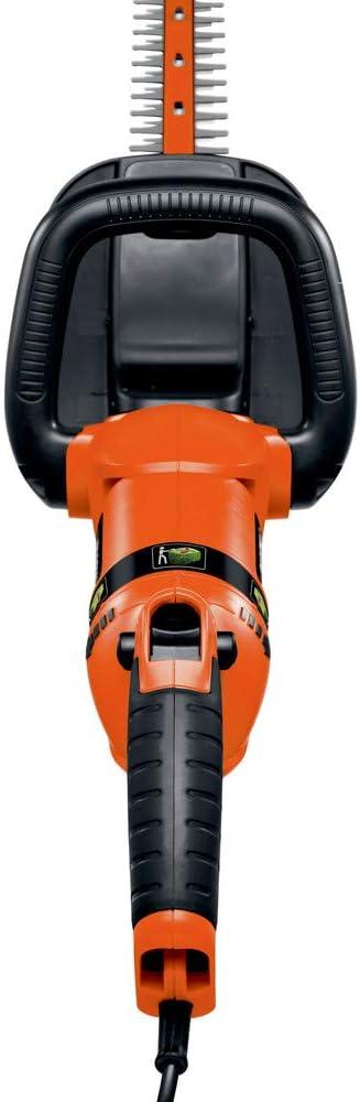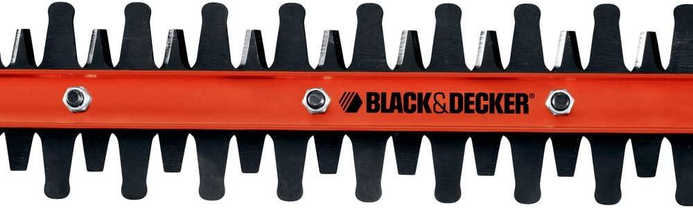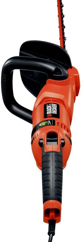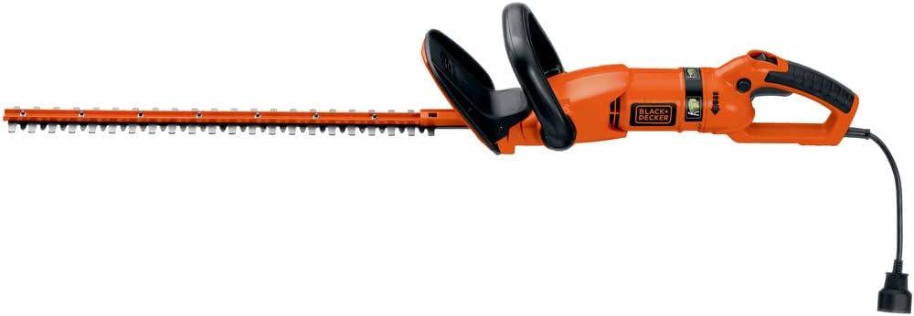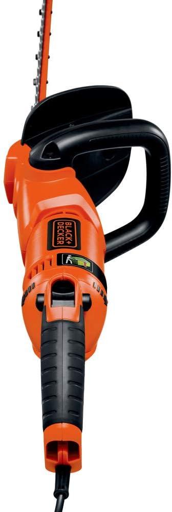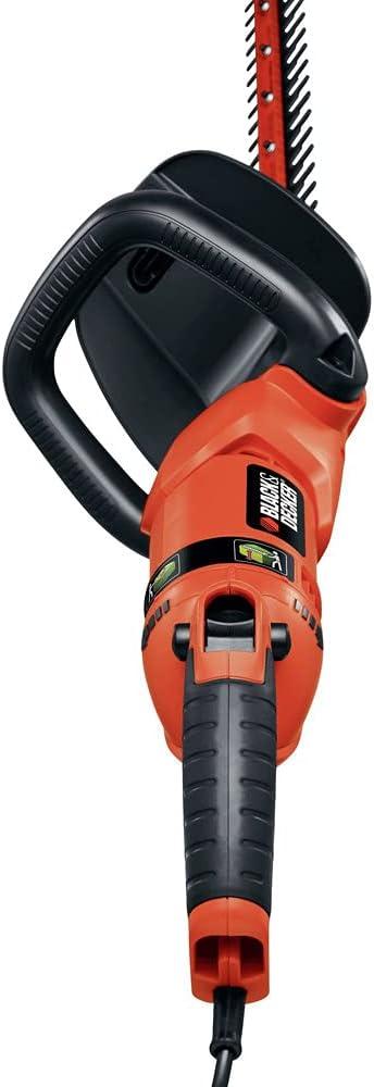 With a 180-degree rotating handle, this 24-inch BLACK+DECKER hedge trimmer can tackle tough overgrowth when trimming vertically or horizontally. Dual-action blades of the bush trimmer help you trim with less vibration compared to BLACK+DECKER single action blade models.