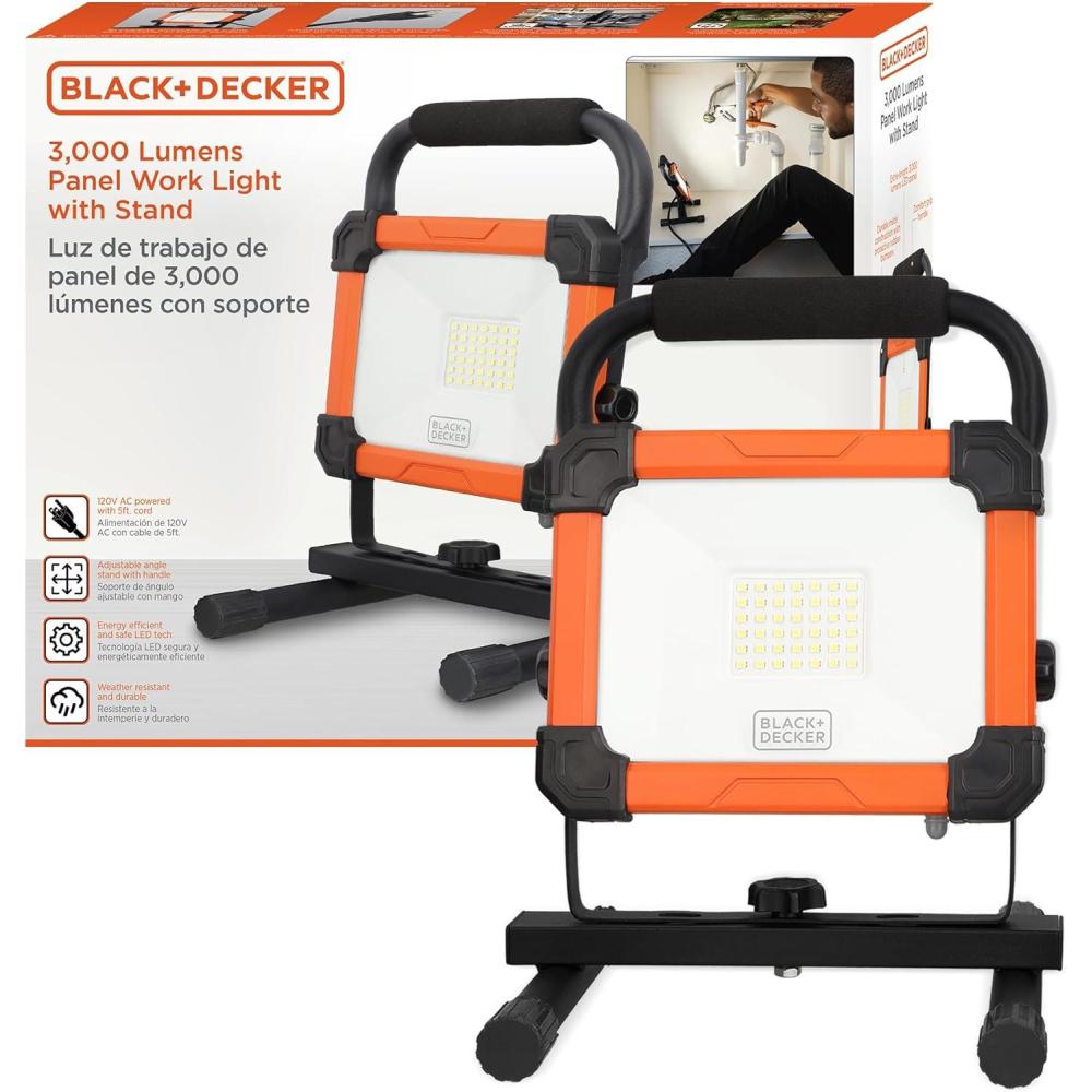 imageBLACKDECKER LED Work Light 3000 Lumens LED Panel Flood Light IP65 Waterproof Shock Resistant 120 Beam Angle ETL Certified Pivoting HStand Tripod Compatible Compact ampamp Portable 120V Plug