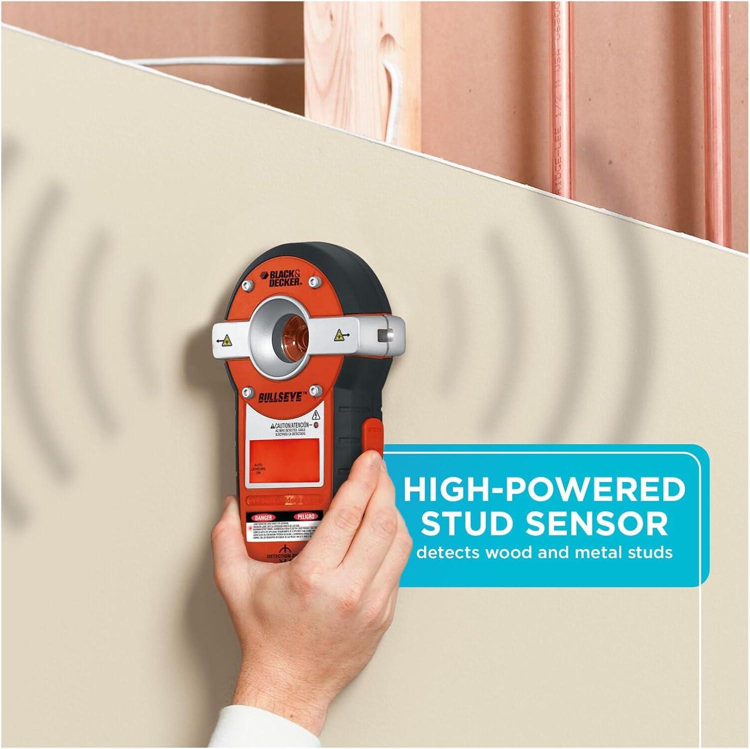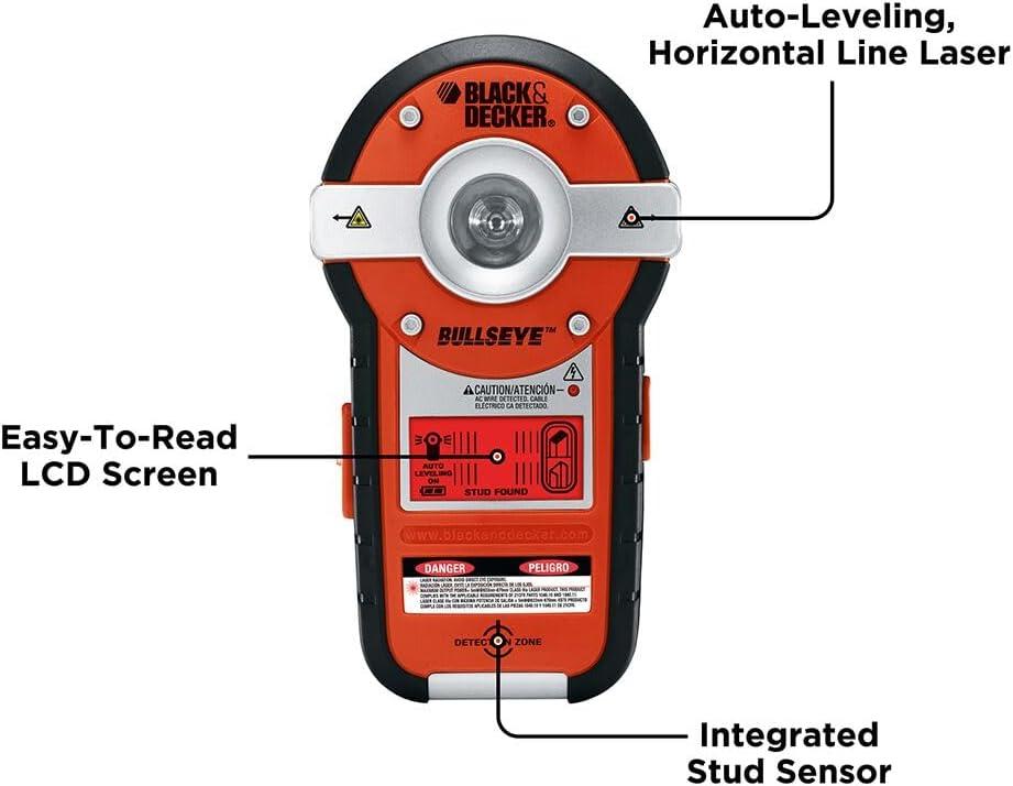 BLACK+DECKER BullsEye Auto- Leveling Interior Line Laser / Stud Sensor is the complete all-in-one tool for hanging and leveling items on the wall. Perfect for hanging frames and more, the line laser/stud finder detects wood and metal studs behind the surface of your wall, and even detects A/C wires. Our patented BullsEye technology levels automatically, projecting a horizontal level line onto your wall for easily hanging and mounting frames. The unit’s built-in LCD display is easy to read for users of all skill levels, and the unit’s compact and lightweight design make it convenient for all.