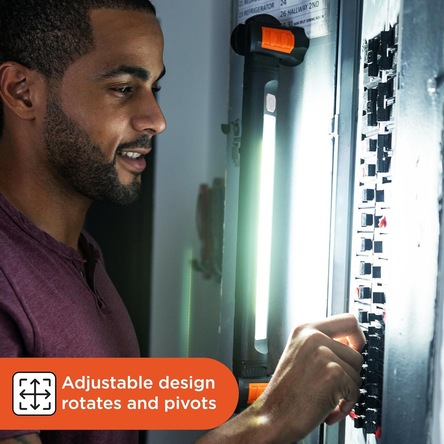 BLACK+DECKER 1,400LM COB Utility Light Bar delivers powerful, even illumination for a wide range of tasks indoors and outdoors. Featuring an ultra-bright 1,400-lumen COB LED, this utility light offers four lighting modes, high, low, red, and flashing emergency, allowing you to adapt to different environments and needs. Whether you’re working on DIY projects, performing home repairs, maintaining your car, camping, or dealing with roadside emergencies, this light provides consistent and reliable visibility. The slim, space-saving design makes it easy to store or position in tight spaces such as closets, crawl spaces, under sinks, or beneath car hoods, ensuring you have light exactly where you need it. Its dual feet rotate 180° and the center console rotates a full 360°, giving you precise control over the light direction. Hands-free operation is simple with dual heavy-duty magnets for mounting to metal surfaces and two fold-out hooks with 360° ball joints for hanging from beams, pipes, or other overhead supports. The built-in 2,600mAh rechargeable battery offers up to 5.5 hours of runtime, depending on the selected mode, and recharges easily via the included USB-C cable. It also doubles as a USB-A power bank for charging small devices, making it a practical addition to any emergency kit. Designed for durability, the light is IP54 weather-resistant to withstand dust and rain, and IK07 shock-resistant to handle drops and impacts. Sturdy rubber grips further enhance handling and durability, ensuring long-lasting performance in demanding environments. Compact yet powerful, this BLACK+DECKER light bar is an essential tool for work, travel, or preparedness.