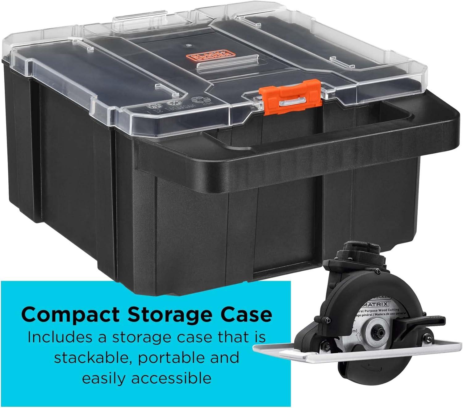 The BLACK+DECKER MATRIX(TM) Trim Saw Attachment is part of the MATRIX(TM) Quick Connect System (TM). This Trim Saw attachment can be used with any Power Unit in the MATRIX (TM) System (Power Unit Sold Separately). Includes:(1) Trim Saw Attachment (1) 3 3/8″ General Purpose Wood Cutting Blade, (1) Hex Wrench and (1) storage case.
