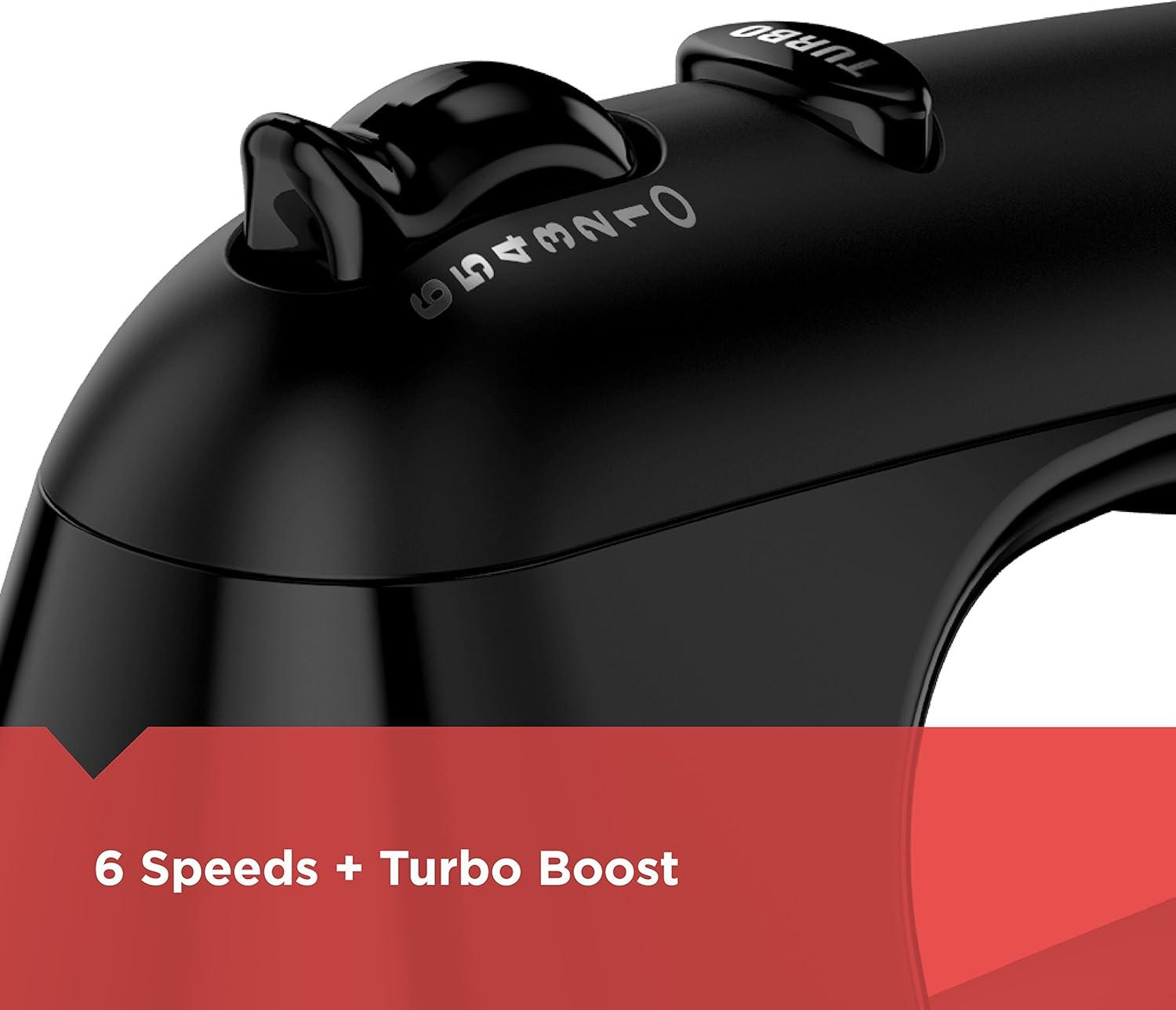 The BLACK+DECKER 6-Speed Hand Mixer is for every mixing task. With five dishwasher-safe attachments, you can easily stir, beat, whisk, whip, and even work with dough. With 250 watts of power and a Turbo Boost button, you can do it all in no time. Plus, the starting speed is slower* for less mess mixing! *compared to BLACK+DECKER MX217 Mixers