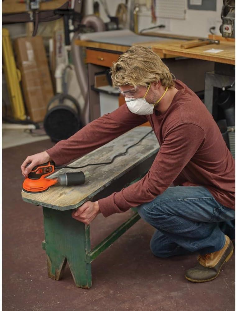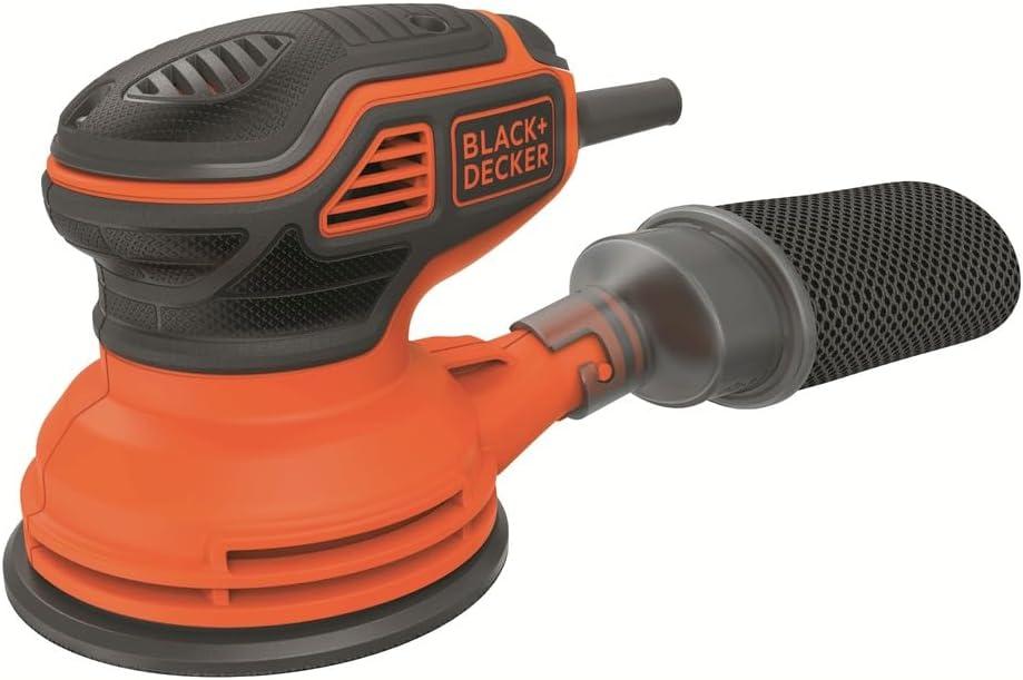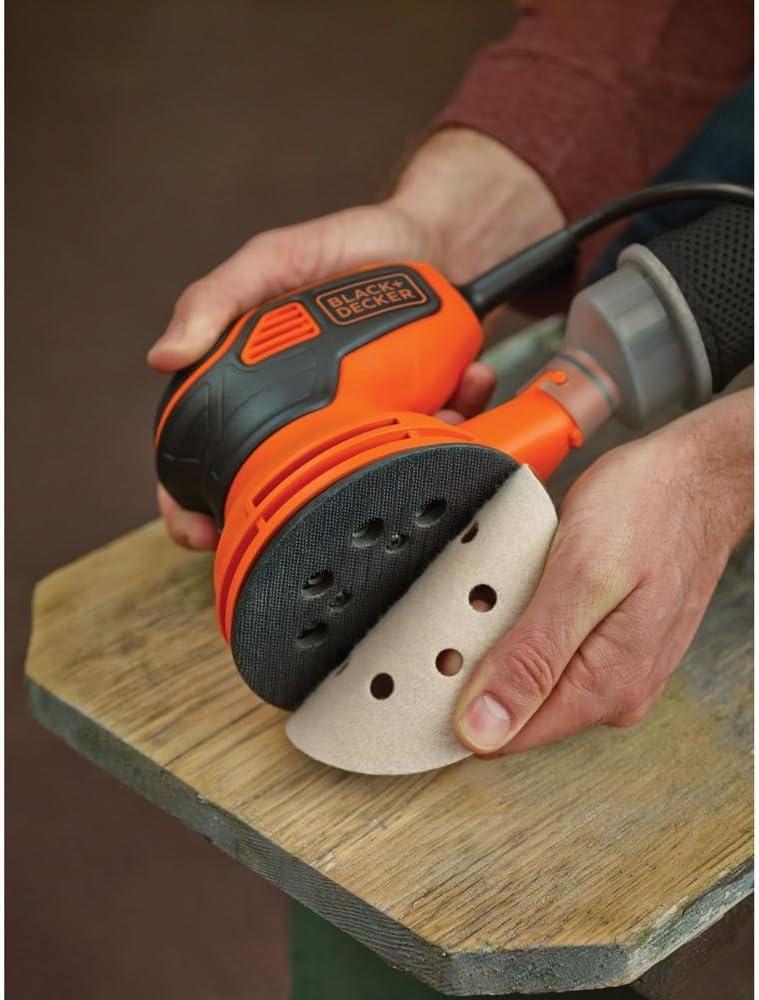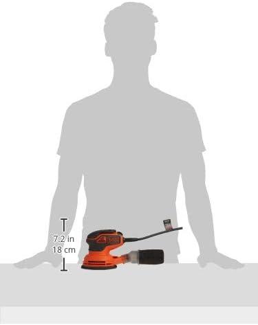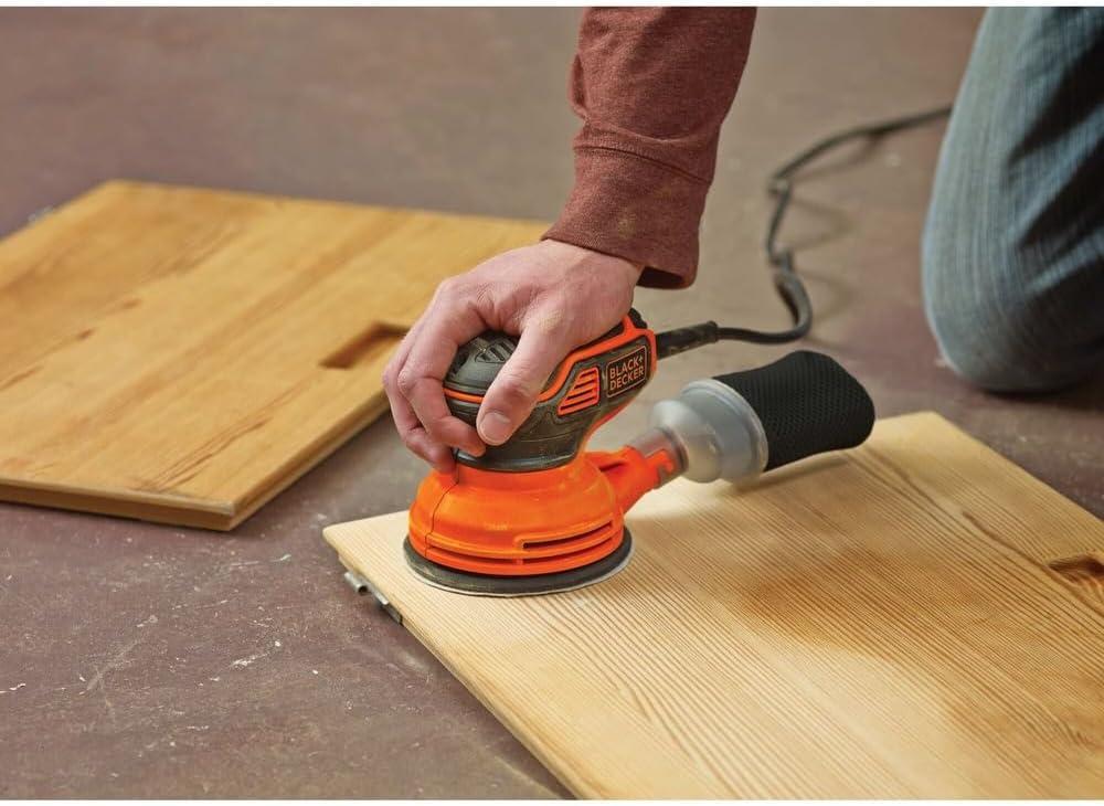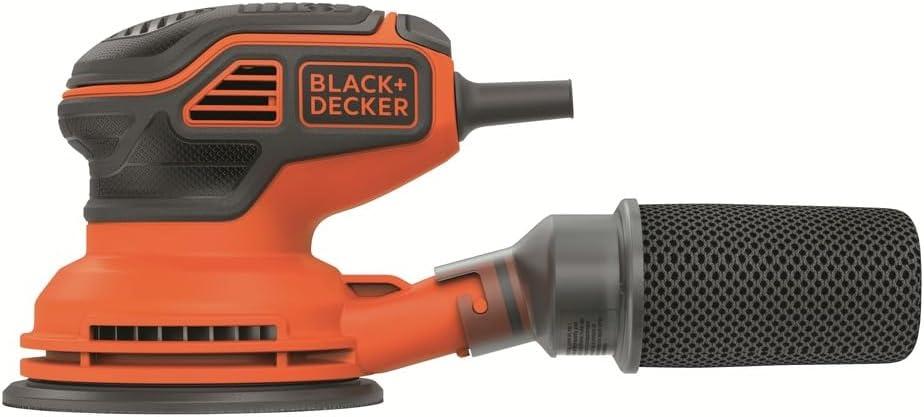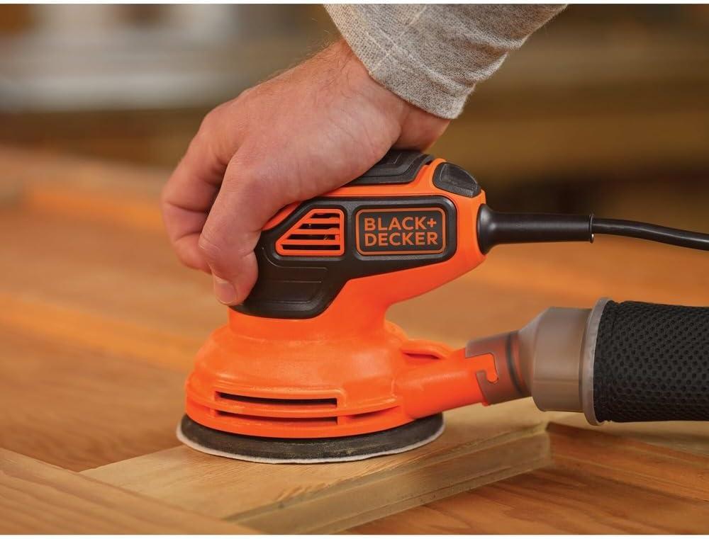 The BLACK+DECKER 5 in. electric random orbit sander is ready for a wide range DIY tasks thanks to its powerful yet compact design. Use this random orbit sander for surface preparation, finishing projects, shaping wood, and removing paint, stain, and varnish from wood, metal, and plastic. The paddle switch provides natural and comfortable actuation, while the hook-and-loop system ensures fast and easy sandpaper changes. Plus, a high-performance dust collection system helps keep sawdust and debris out of your way. And the corded design means you'll have unlimited power for every job.