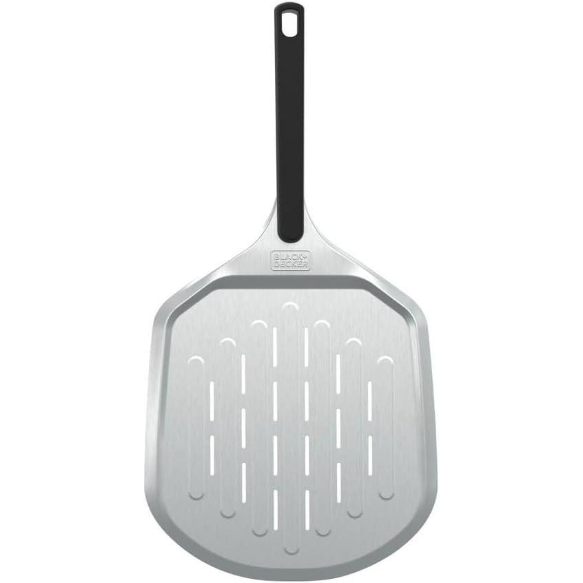 Prep, launch, and retrieve pizza with ease using the BLACK+DECKER 12 in. Metal Pizza Peel. The lightweight, thin design helps you retrieve your pizza by quickly sliding the peel under the cooked pizza. It’s designed with perforations to help remove excess flour on the bottom of the dough and easily transfer your pizza from oven to table. The long, plastic handle is heat resistant and features a hang hole for simple storage. Just slide it onto the hooks of the BLACK+DECKER 12 in. Pizza Oven Stand and store until next time.