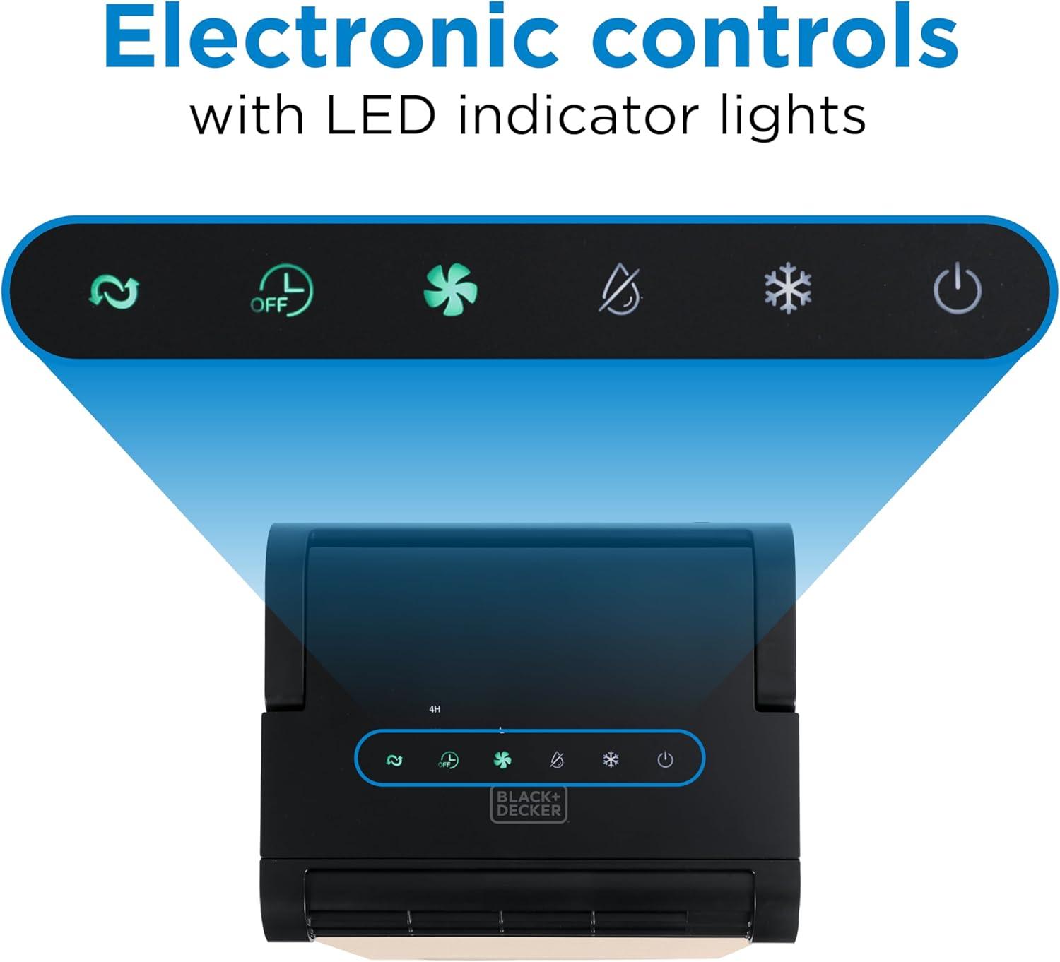 Enjoy a comfortable home climate with this versatile BLACK+DECKER 10,000 BTU (6,000 BTU SACC) portable air conditioner unit. Cools the air down to 61 degrees Fahrenheit , dehumidifies up to 60 pints every 24 hours, and circulates air with 3 fan settings to stand up to summer heat in rooms up to 450 sq. ft. Offering immediate, uninterrupted comfort with it's up and down auto air swing, this Portable Air Conditioner features easy-to-use LED electronic controls and is quiet while you sleep, 52dB on highest setting. Window kit includes foam seal, slider bracket, 5.9 inch diameter air exhaust hose, hose inlet and outlet, 2 locking screws and drain hose. Works in double hung or sliding windows only. To minimize noise and vibration, the air conditioner should be placed on a firm floor. For safe and secure positioning, place the unit on a smooth, level floor strong enough to support the unit. For a better cooling, make sure all the windows and doors are closed. Connect the duct and make sure it can function properly. Micro processor control delays the compressor from operating until 3 mins have passed. Thermostat range is from 61 degrees to 88 degrees Fahrenheit. Includes easy to use LCD remote control (2 AAA batteries required for remote – not included). 115V~/60Hz. 1050 Watts. Annual energy usage 525 Kwh. Start up amps: 36, working amps: 9.5. 3 prong grounded LCDI/Type B. ETL safety certified. 3 Cool Speeds (High 184 CFM, Medium 148 CFM & Low 132 CFM.