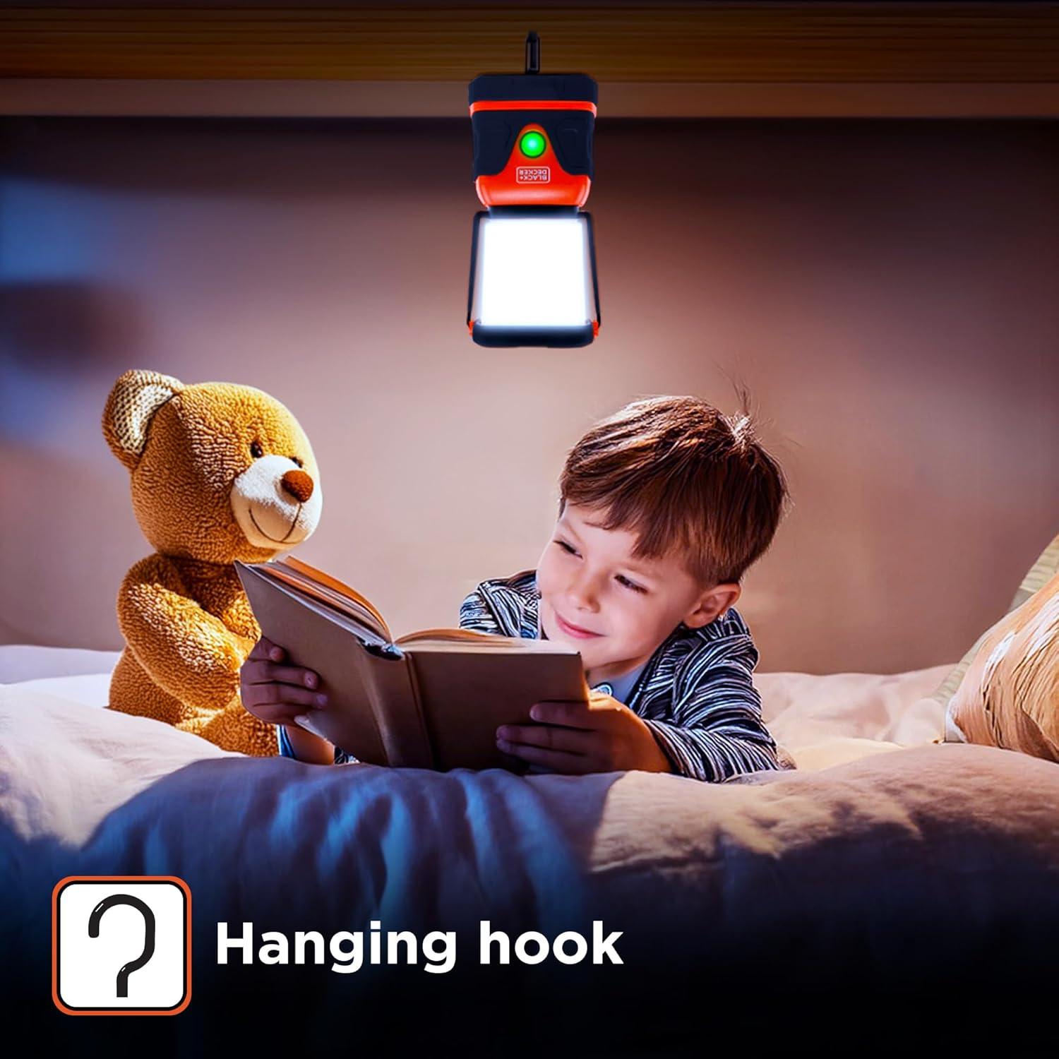 The BLACK+DECKER 1,000 Lumens Rechargeable LED Lantern delivers dependable 360° illumination with multiple brightness and color temperature options, making it an ideal lighting solution for both indoor and outdoor use. Designed with a full-circle LED light panel, this lantern offers powerful multiwhite lighting, featuring three dimmable levels in both warm and cool white, as well as a dedicated SOS mode for emergency signaling. Its frosted lens cover helps eliminate harsh glare, providing a smooth, evenly distributed glow that’s perfect for shared areas like campsites, cabins, and tents. Whether you're reading, cooking, or working on tasks during a power outage, the lantern’s soft lighting keeps you comfortable and well-lit. Weighing just a few ounces and equipped with a folding hook and handle, it’s made for portability and flexible mounting. Hang it from tent ceilings, tree limbs, or beams, or simply stand it upright on any flat surface. The rugged build and IP44 weather resistance protect it from dust, splashes, and light rain, ensuring reliable operation in tough outdoor environments. With a 4,000mAh built-in battery, the lantern delivers up to 12 hours of runtime and doubles as a USB power bank, allowing you to charge phones and devices during camping trips or power outages. Recharge it easily using the included USB-C cable, and rely on its performance in both daily use and emergency situations. Whether you’re preparing for a blackout, lighting up a trail, or upgrading your emergency kit, the BLACK+DECKER 1,000LM Rechargeable Lantern is a dependable, high-performance lighting solution for every adventure.