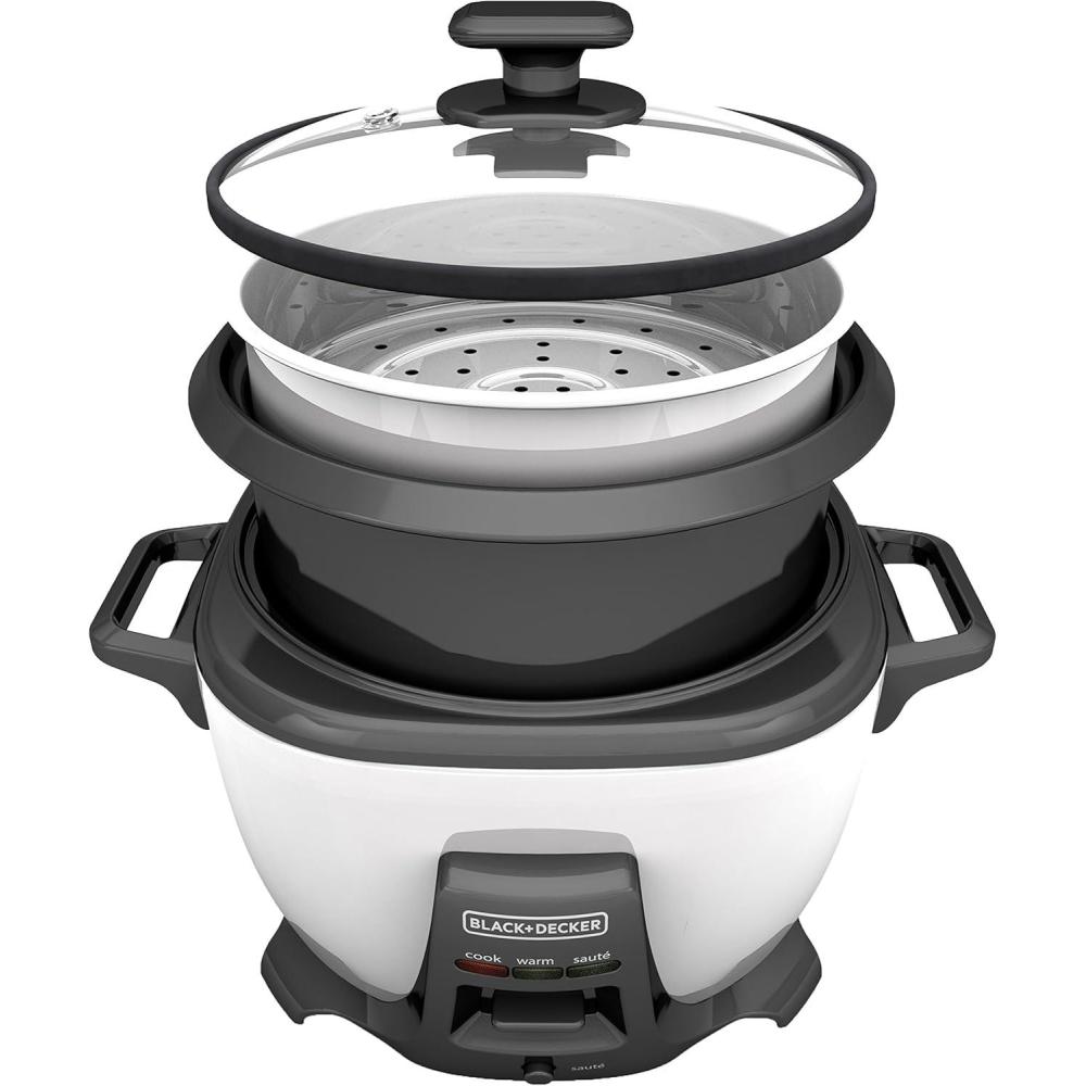 The BLACK + DECKER 28-Cup Rice Cooker makes it easy to create rice and more for family dinners and large gatherings. The nonstick, removable cooking bowl features an extra-large capacity for rice and grains, soups and stews, or even oatmeal and pasta. The included steaming basket increases your cooking options with healthy preparation of fish, veggies, and more. Plus, the cooking bowl, tempered glass lid, and included accessories are all dishwasher-safe for easy cleanup.