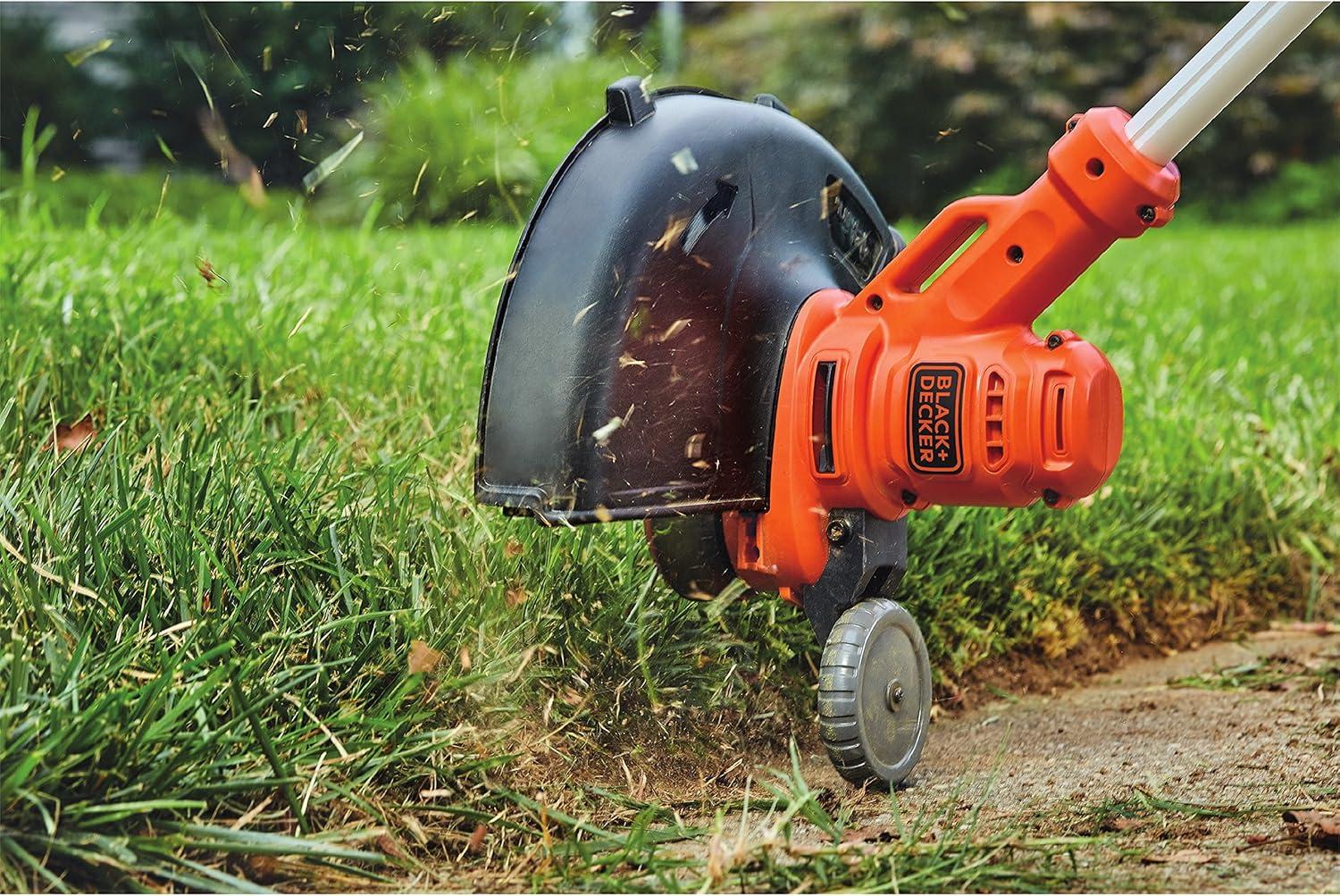 2-in-1 Trim or Edge with wheeled edge guide – just rotate to convert from lawn trimmer to wheeled edger