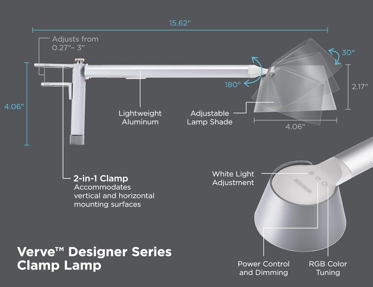 Brilliant design meets convenient control with our BLACK+DECKER Smart Designer Desk Lamp with Clamp Base that’s easy to set up, delightful to customize, and seamlessly integrates with the Amazon Alexa eco-system. Easily bring the light to your workspace with the simple tap of an app or voice command. With a native connection to the Amazon Alexa eco-system, our lights are surprisingly simple to set up, use, and integrate into your daily routines; no third-party app required. Featuring a unique, 2-in-1 design, this sleek light can be secured to vertical or horizontal surfaces up to 3” thick, making it an ideal accent for shelves, headboards, cubicle walls, and more. With three points of adjustability on the lamp, its design has been crafted for ultimate customization, no matter where you need light. And, with endless controls and modes, set the scene for any occasion: wake and sleep with your body’s natural circadian rhythm, work with true white lighting, and unwind to a spectrum of 16 million colors. Durable, sleek, and carefully crafted for premium strength and durability, our Verve Designer Series Smart LED Desk Lamps offers a range of models and options for work, play, and relaxation that seamlessly integrates with the Amazon Alexa eco-system.
