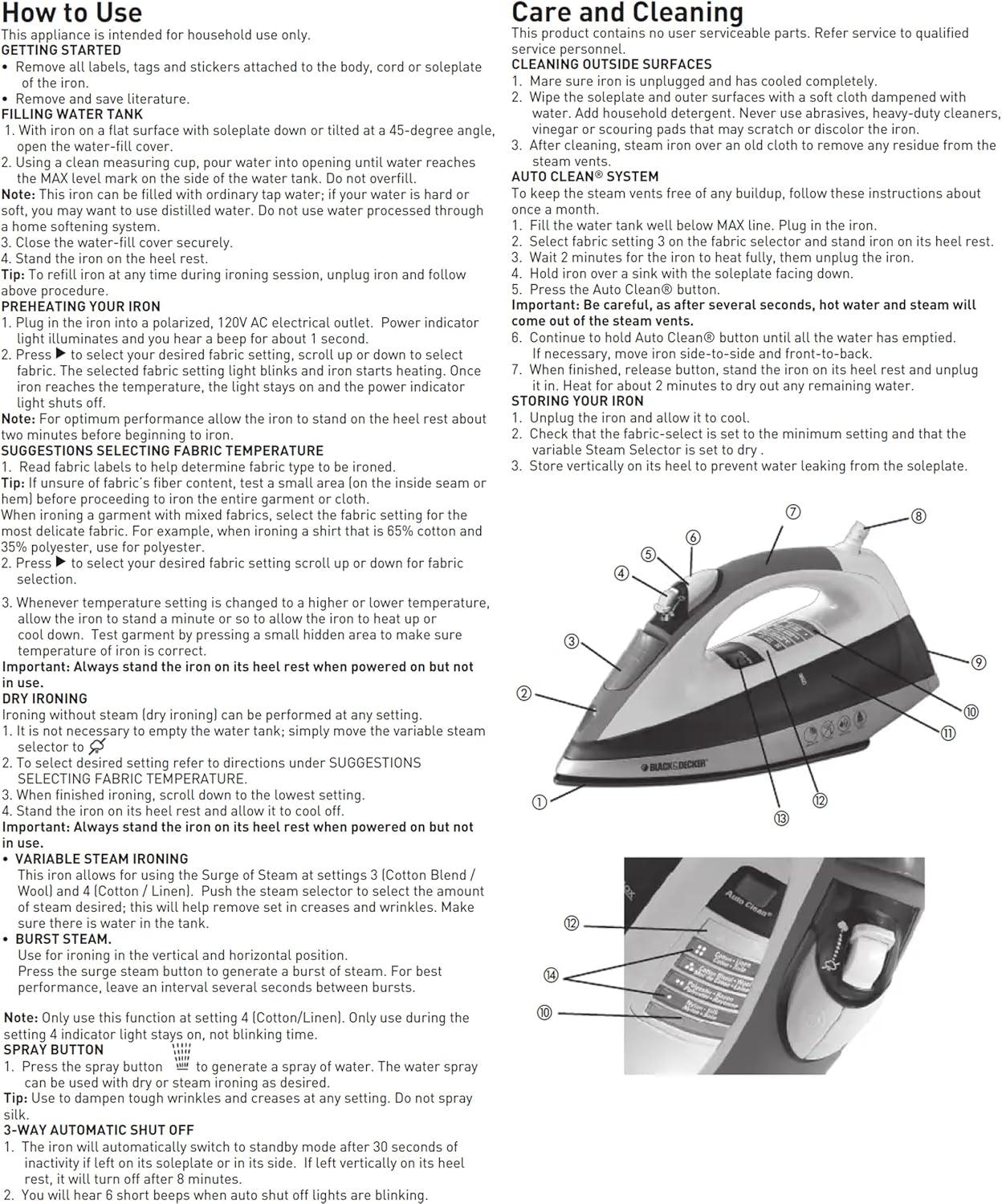 Style Name:Vitessa Advanced Steam Iron Product Description BLACK+DECKER, the #1 brand in clothes irons*, is streamlining garment care with the Vitessa Nonstick Advanced Steam Iron. The Even Steam soleplate is engineered to produce more consistent steam flow from heel to tip** for fast, professional results. SmartSteam Technology combines steam and temperature controls into one easy-to-use dial. Plus, this electric iron delivers powerful bursts of steam to aggressively take out wrinkles, and can even be used vertically to quickly touch-up clothes right on the hanger or curtains and drapes. *Source: NPD POS, data as of November 2016. **vs BLACK+DECKER IR08x standard iron with standard soleplate Brand Story By Black & Decker
