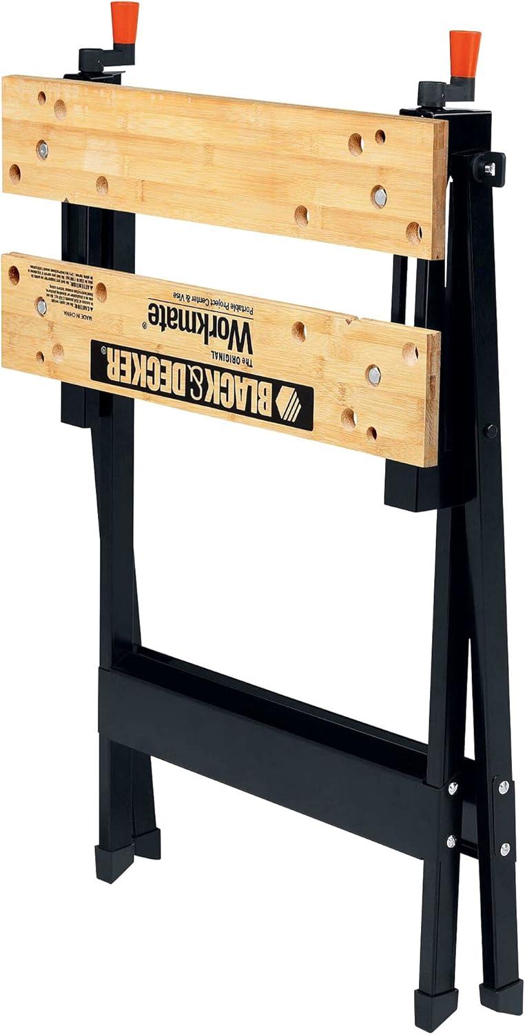 Black & Decker WM125 Workmate 125 350 Pound Capacity Portable Work Bench is a necessity for the serious craftsman. Weighing only 15 pounds, this heavy-duty workbench holds up to 350 pounds to accommodate a wide variety of projects. Dual clamp cranks and four swivel pegs can be angled for unique jobs when clamping a variety of materials. Jaws resist swelling and warping over time. Non-skid feet prevent sliding while you work. The bench folds flat for compact storage.