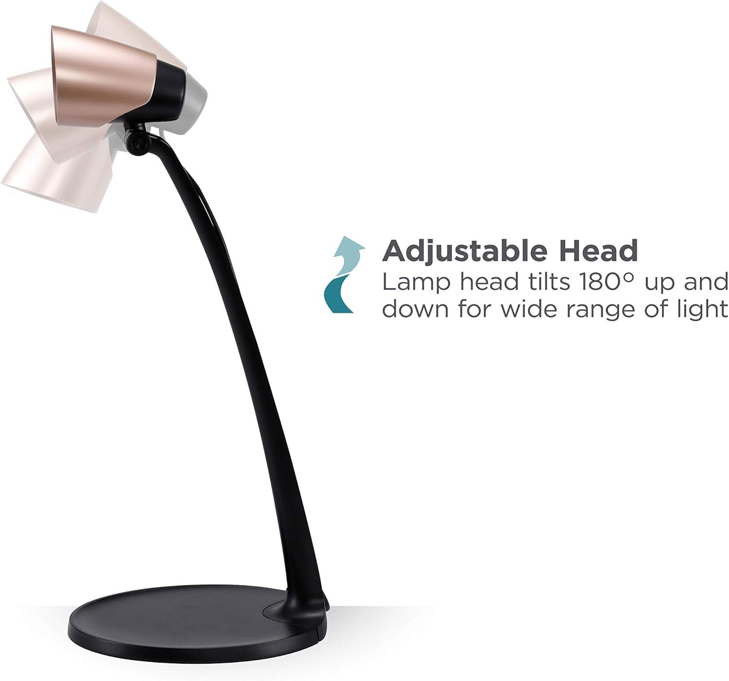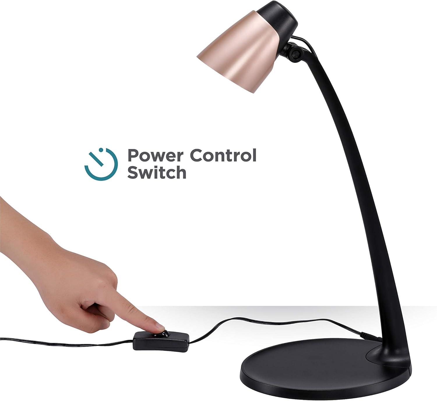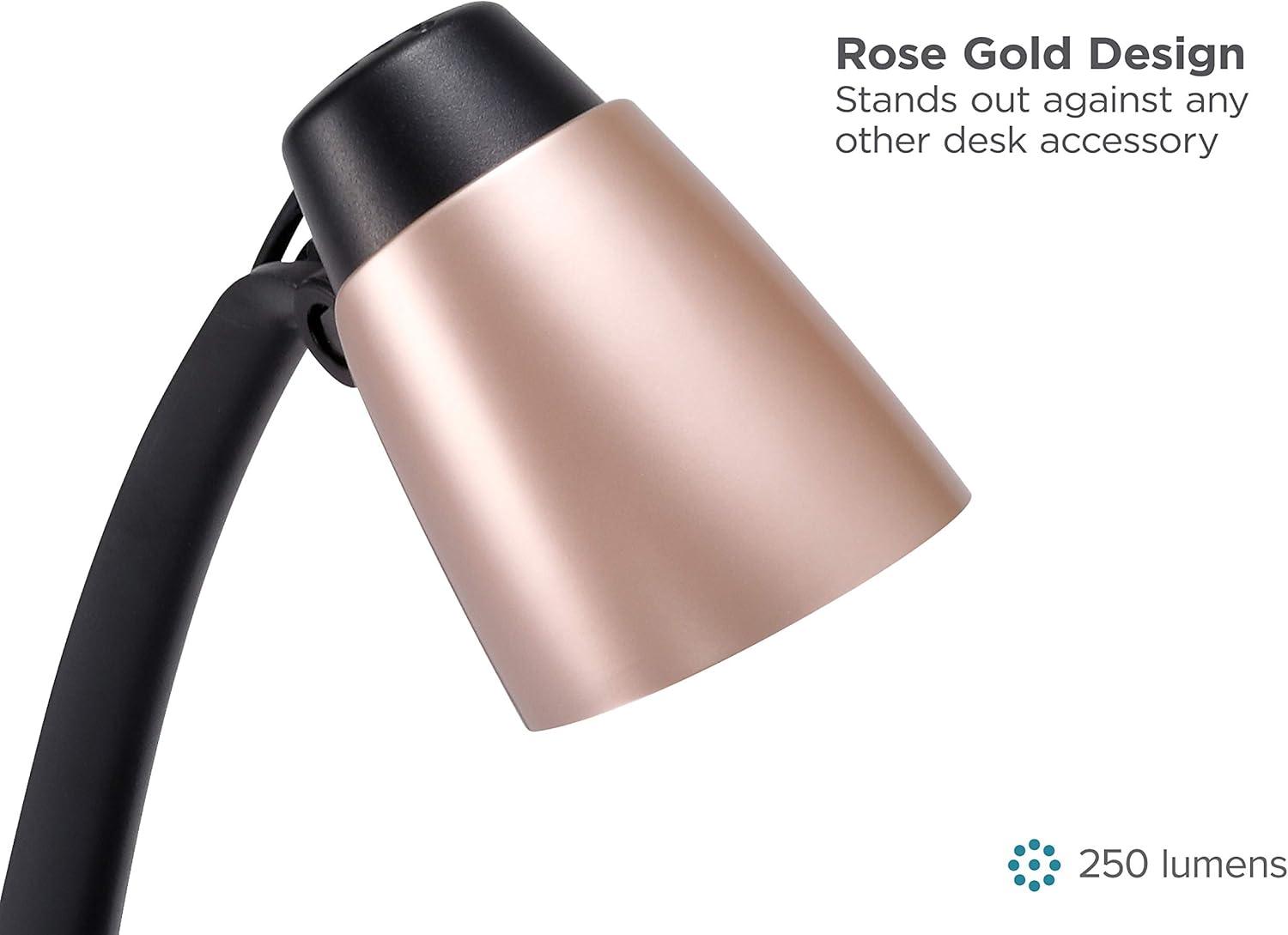 If you're in search for a simple lamp with style, then this LED rose gold desk lamp is calling your name. With a black lamp arm and base, it takes on a classic look, ideal for an office, in a dorm or on a bedside table. The metallic rose gold lampshade brings a light pop of color, providing this lamp is a modern style. This rose gold lamp mimics the look of natural daylight, perfect for those long, focused days at work. Additionally, it uses only 3.5 watts of power and uses LEDs that last up to 50,000 hours. Reliable and easy to use, this desk lamp is too good to pass up.